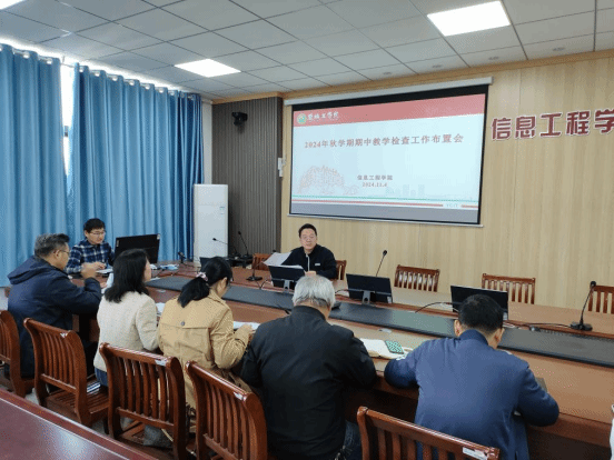 根据我校下发的《关于开展2024年秋学期期中教学检查的通知》文件的要求,11月4日上午,信息工程学院在怀德楼楼B410会议室召开期中教学检查工作部署会议,本次会议由学院副院长徐森主持,教科研办公室主任孔维宾,各教研室主任和学生科科长参与会议。