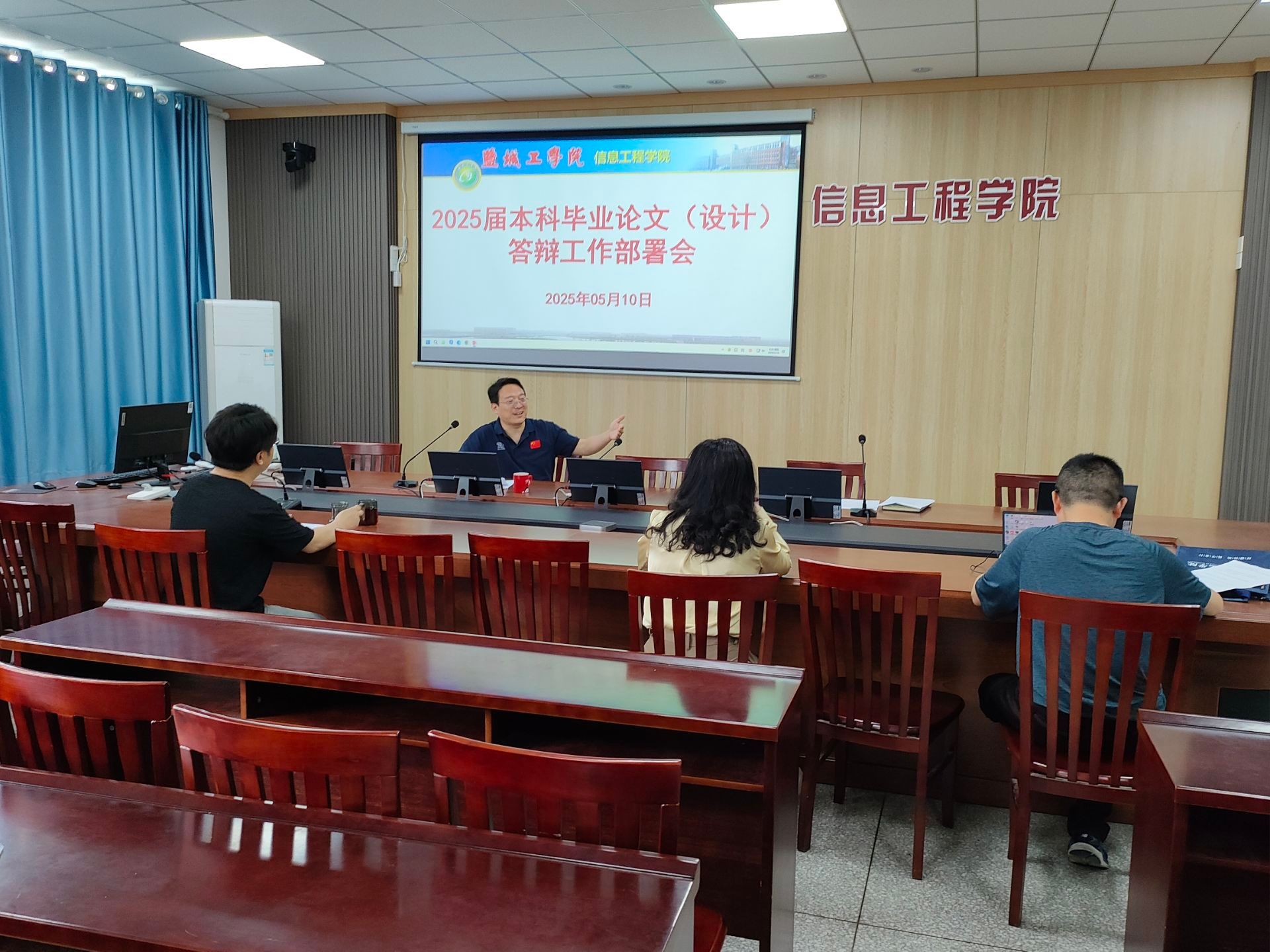 为切实保障本科毕业论文(设计)质量,全面部署2025届本科毕业论文(设计)相关工作,信息工程学院于2025年5月10日在怀德楼B410召开2025届本科毕业论文(设计)答辩工作部署会,参加会议的有副院长徐森、教科研主任孔维宾、各专业系负责人,本次会议由副院长徐森教授主持。
