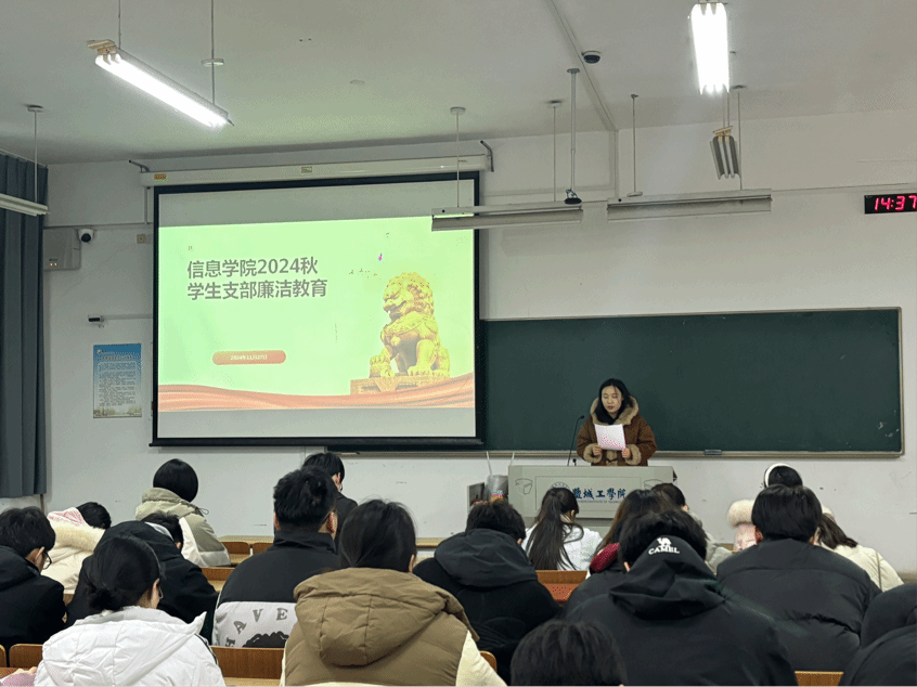 第二项议程为廉洁教育。赵艳宣读了《关于加强新时代廉洁文化建设的意见》,强调廉洁自律在新时代教育的重要性。她指出作为新时代大学生,尤其是学生党员,应将廉洁理念内化于心、外化于行,让清风正气成为青年一代最鲜明的底色,将廉洁教育扎根到日常言行之中,希望同学们做有信仰、讲政治、正能量、有情怀、讲格局、讲奉献、具有引领力的新时代优秀大学生。随后,学生一支部B电子211孟祈海、 学生二支部B计算机212石智轩、 研究生支部Y信息241吴润鑫三位同志结合自身学习与工作交流发言。