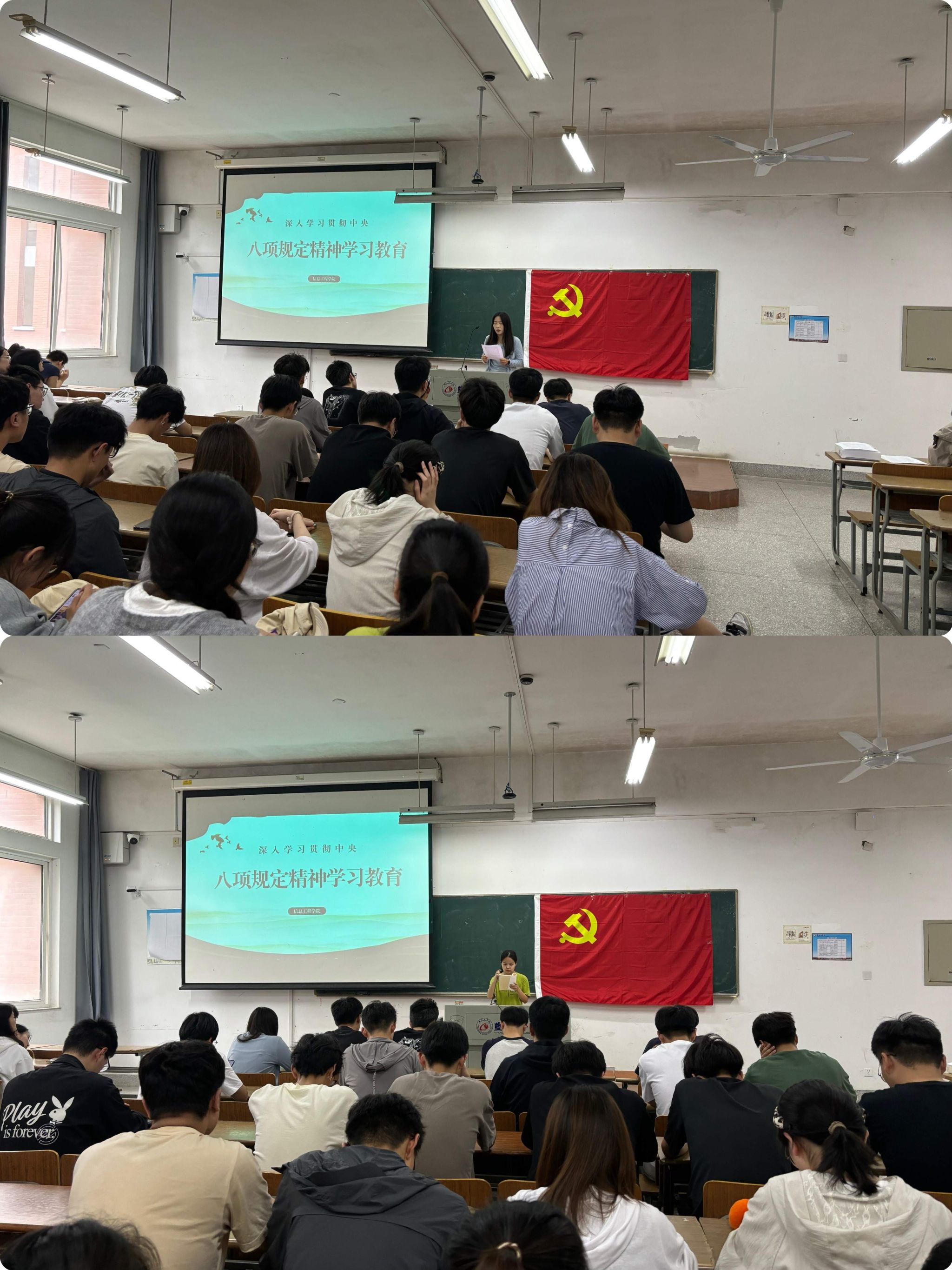 第一项为深入贯彻中央八项规定精神学习教育。赵艳领学了中国纪检编写的《八项规定改变中国》、《注重家庭,注重家教,注重家风》(习近平,《求是》2025年第3期)以及 《健全全面从严治党体系》(习近平,《求是》2025年第4期)三篇文章,强调要深刻把握中央八项规定作为新时代作风建设“切入口”和“动员令”的战略意义,希望学生党员能够将贯彻落实八项规定精神与传承红色家风、健全全面从严治党体系紧密结合,在学习、工作中发挥先锋模范作用。本科第二党支部张梦平领学了《习近平关于加强党的作风建设论述摘编》第五专题“持续深化纠治‘四风’”、第六专题“各级领导干部要带头转变作风,身体力行,以上率下”。随后,研究生党支部陈东、本科第一党支部周彤与本科第二党支部彭光硕结合个人学习工作分别做重点发言。