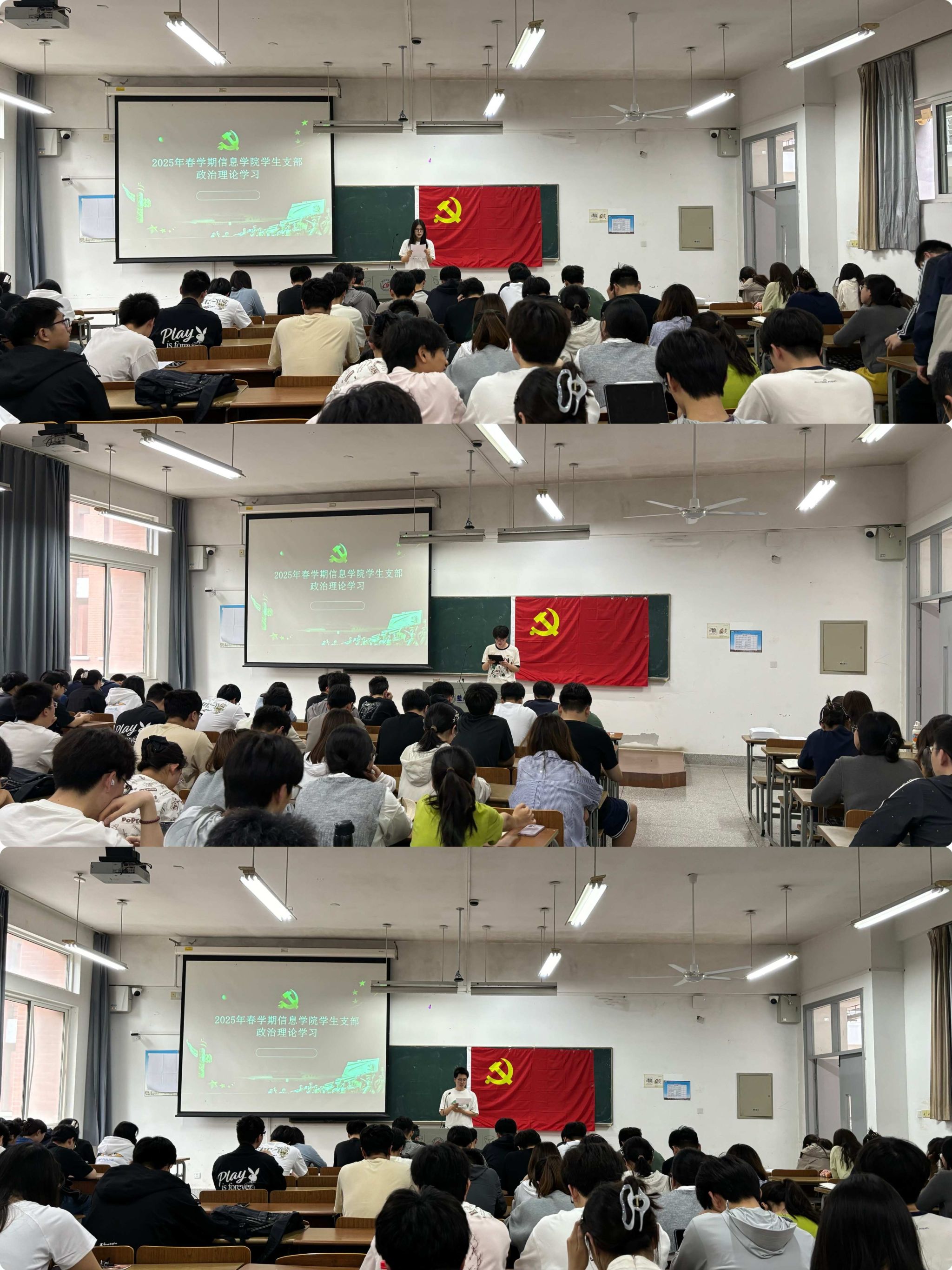 5月14日下午,信息工程学院研究生党支部、本科第一党支部、本科第二党支部在博学楼A207教室联合开展2025年春学期第五次政治理论学习暨发展对象培训。组织员赵艳、各支部党员及2025年春学期26名发展对象参加了本次会议。
