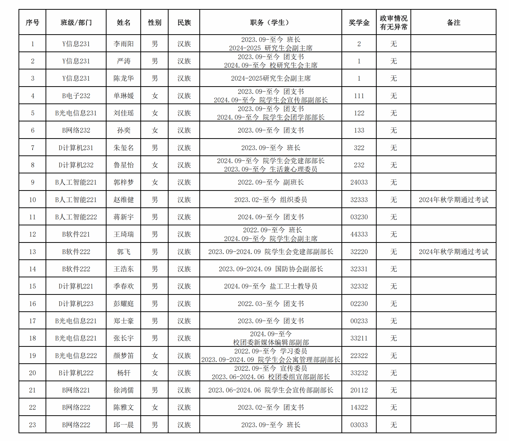 经各学生党支部支委会讨论,学院党委会研究,2025年春学期信息工程学院党委报送了28名发展对象到学校党委备案,并对这28名发展对象进行了政审,审查未发现异常情况。28名发展对象参加了学校组织的发展对象培训班集中学习,其中有25人通过考核。经2025年5月22日学院党委会审议,从25名通过政审和考核的发展对象中确定了23名拟发展党员人选报学校党委预审,现予以公示,名单如下: