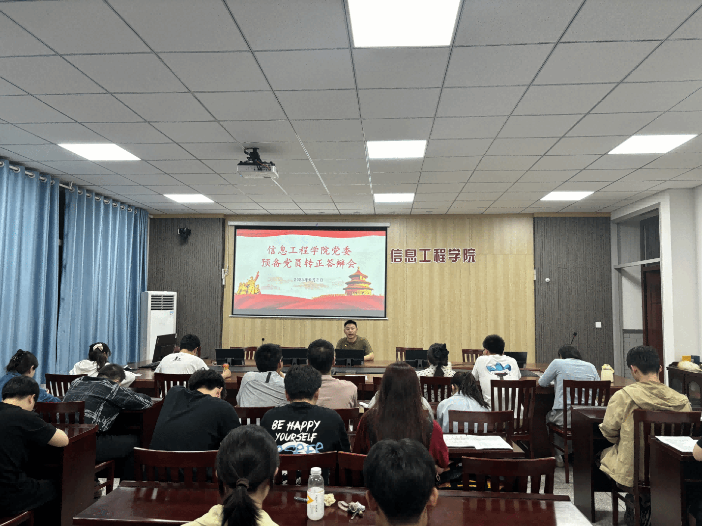 6月3日晚,信息工程学院在希望大道校区怀德楼B410会议室举行2025年春学期预备党员转正答辩会。本次答辩评审工作由学院党委书记杨军担任组长,党委副书记王源、团委副书记兼学工办副主任纪锦霖及各党支部书记共同组成评审小组。组织员赵艳主持会议,教工第一党支部、本科第一党支部、本科第二党支部以及研究生支部共计23名预备党员参加本次答辩会。