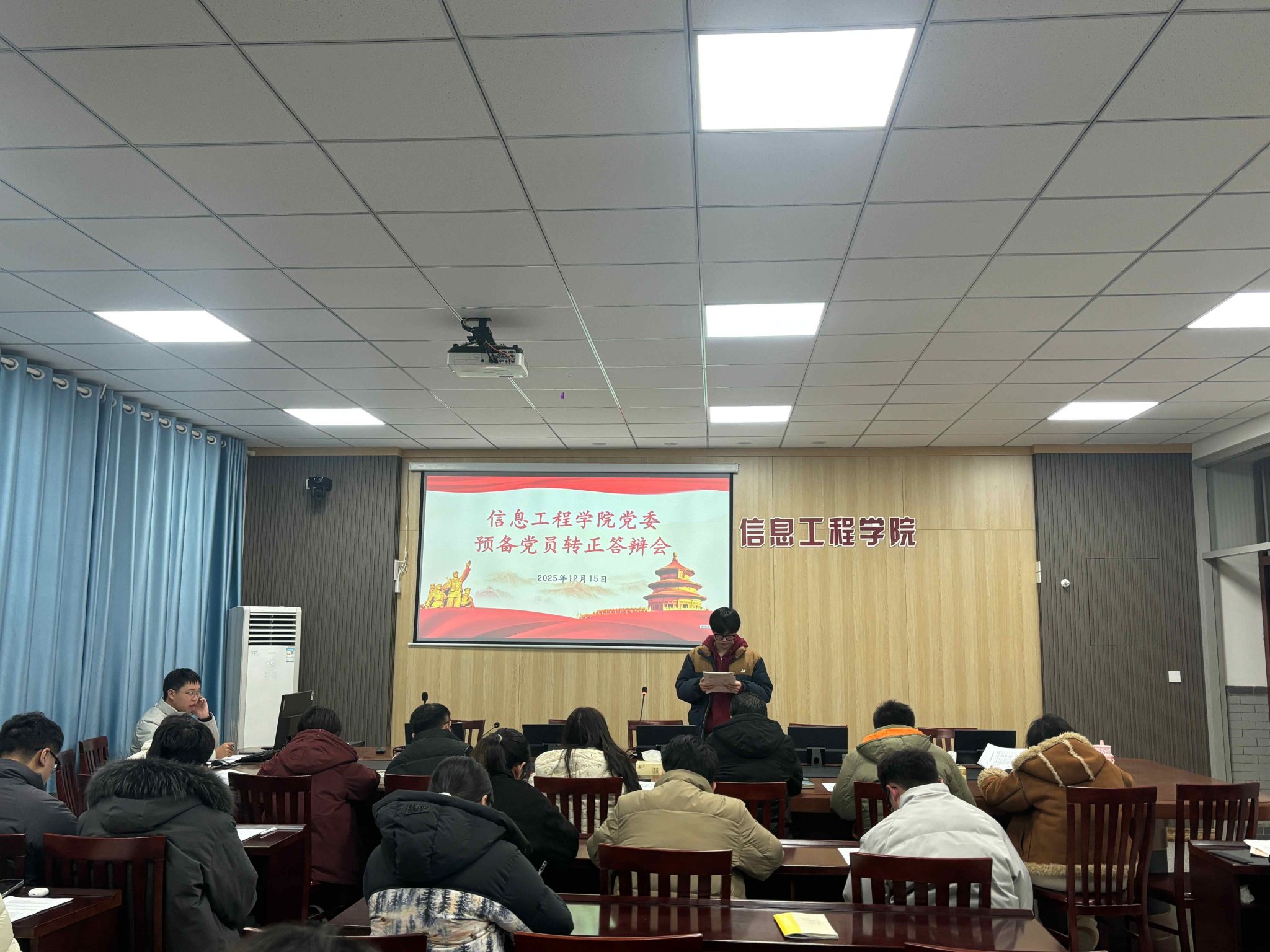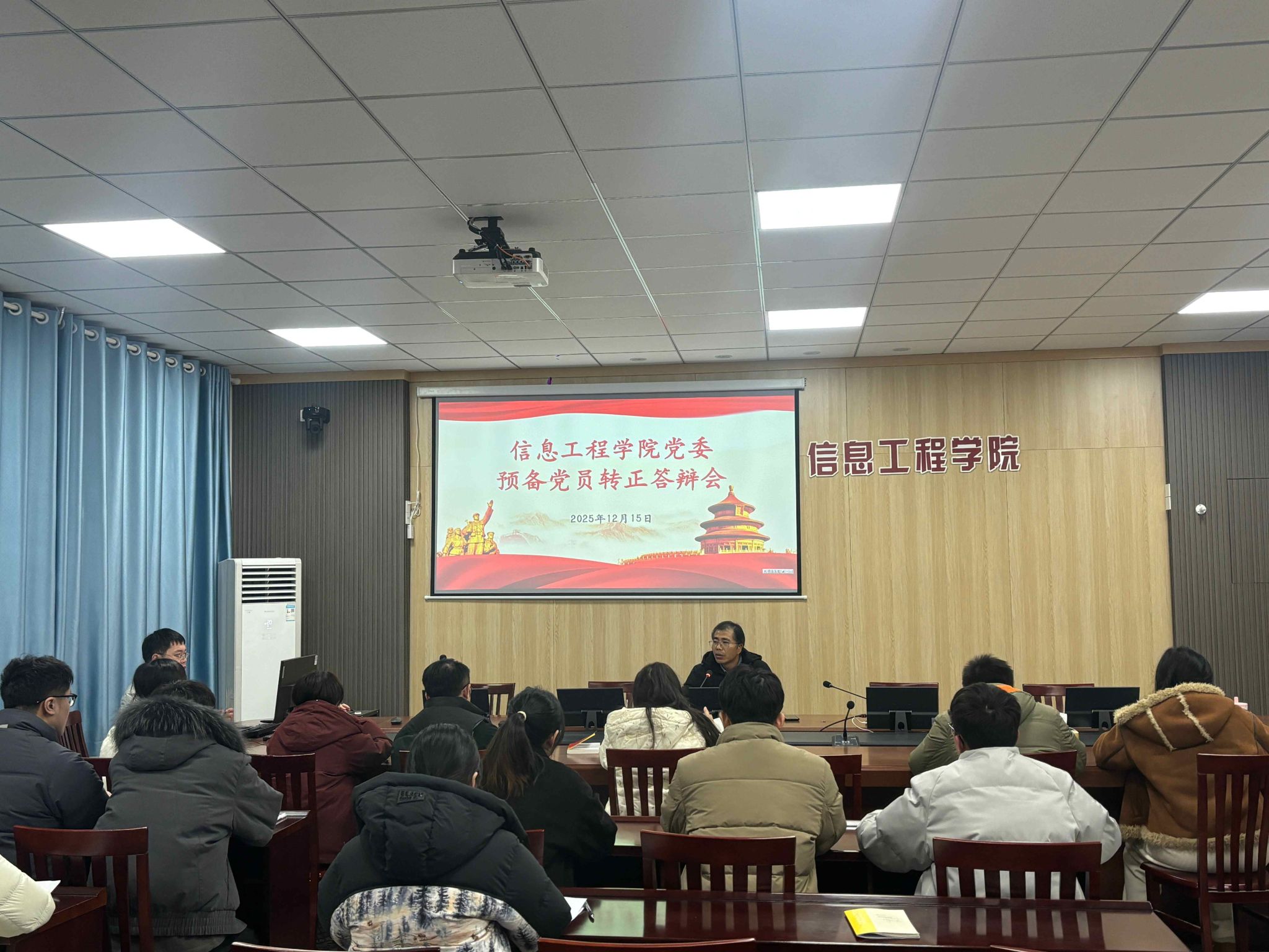 12月15日晚,信息工程学院在希望大道校区怀德楼B410会议室举行2025年秋学期预备党员转正答辩会。本次答辩评审工作由党委副书记王源、团委副书记兼学工办副主任纪锦霖及各党支部书记、支委会成员共同组成评审小组。组织员赵艳主持会议,本科第一党支部、本科第二党支部以及研究生党支部共计16名拟转正预备党员参加答辩会。