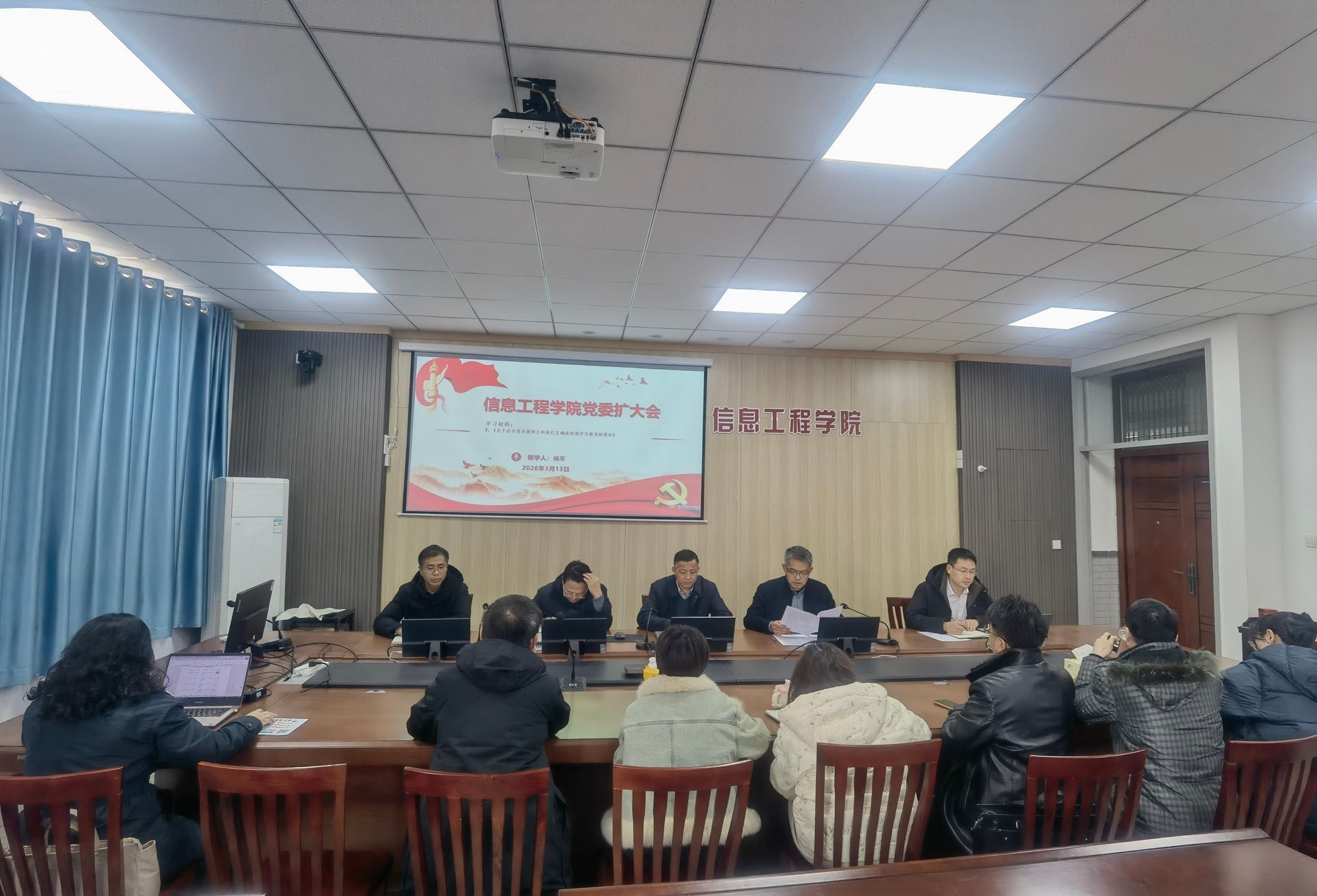 为深入学习贯彻党中央决策部署,严格落实上级党组织关于树立和践行正确政绩观学习教育的工作要求,3月13日,信息工程学院在学院B410会议室召开树立和践行正确政绩观学习教育启动部署会。学院党委书记杨军主持会议,学院领导班子成员、党委委员、全体党支部书记及党员代表参加会议。