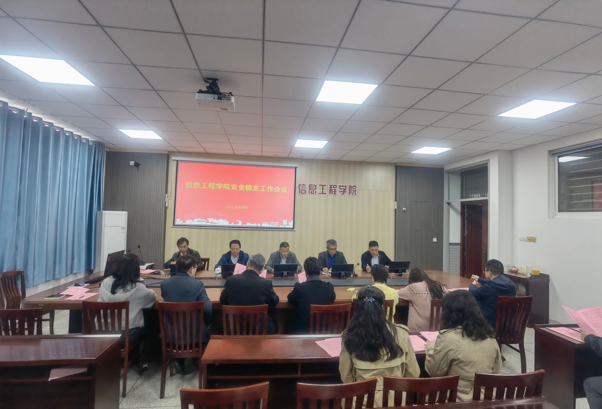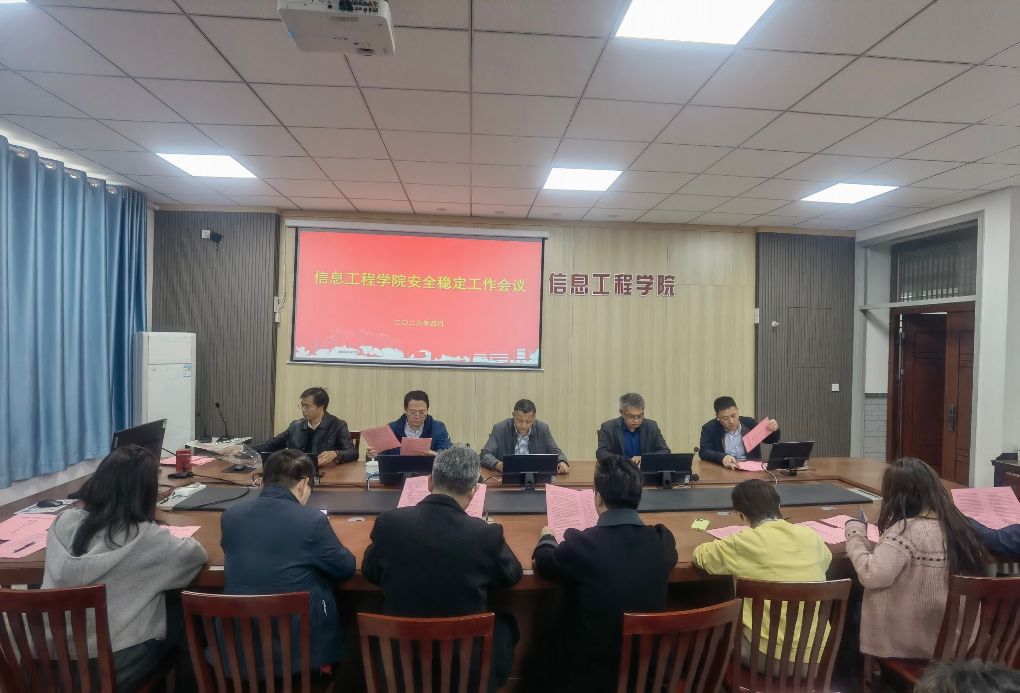 为深入贯彻落实学校安全稳定工作会议精神,进一步强化学院安全管理工作,压实安全稳定责任,4月16日下午,信息工程学院在怀德楼B410会议室召开2026年安全稳定工作会议。会议由学院党委书记杨军主持,院长王如刚,副书记、纪检委员王源,副院长徐森、周锋,学院全体科级干部、党支部书记、专业系主任、实验中心主任参加本次会议。