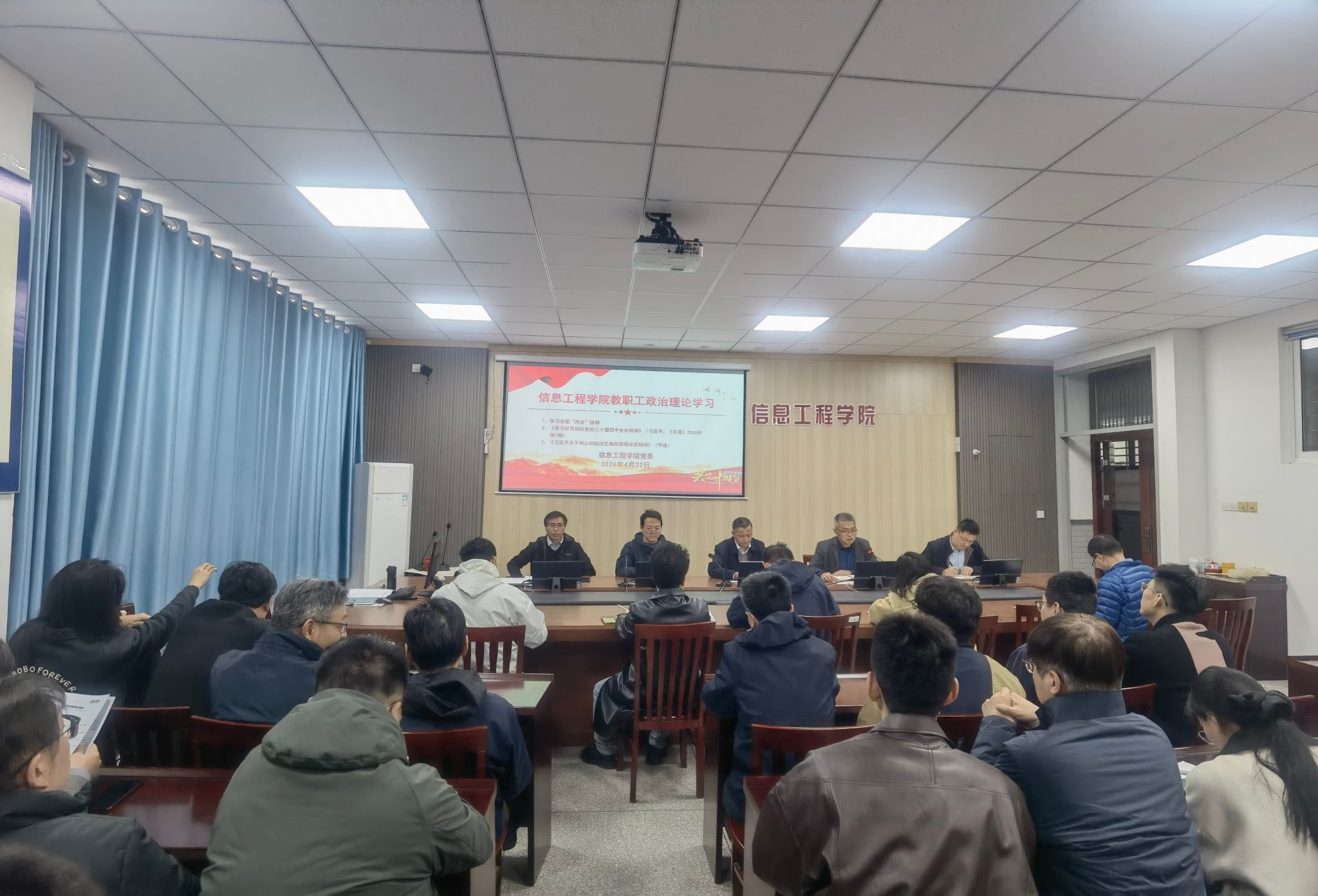 4月22日下午,信息工程学院全体教职工在怀德楼B410学院会议室举行2026年春学期第三次教职工政治理论学习,会议集中学习了全国两会精神、习近平总书记发表在《求是》杂志2026年第1期的署名文章《学习好贯彻好党的二十届四中全会精神》和《习近平关于树立和践行正确政绩观论述摘编》(节选)。