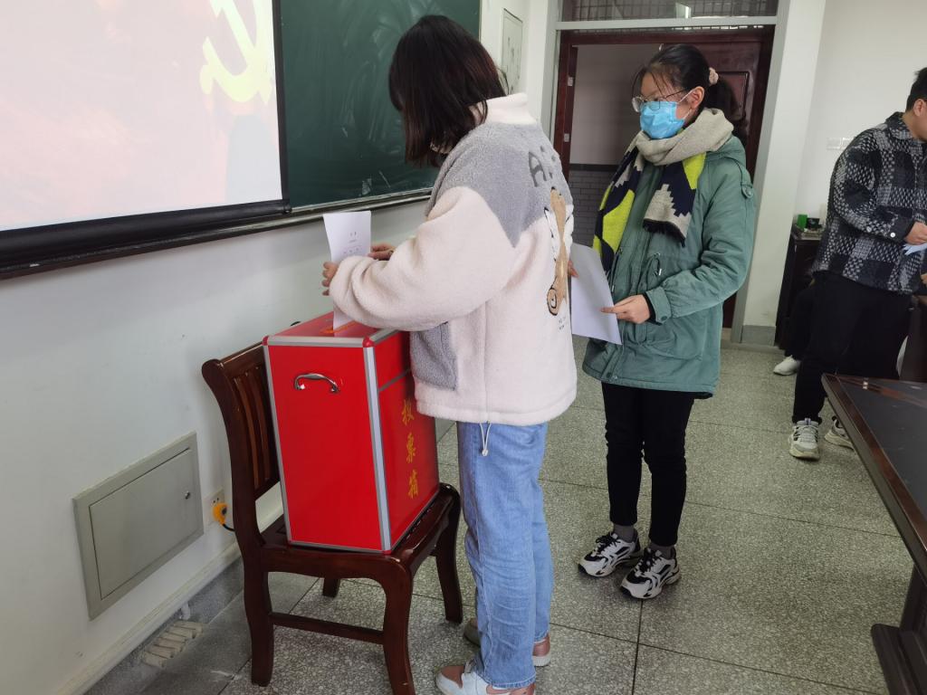 本次支部大会严格按照支部委员会换届选举程序进行,经过党员投票,计票员和监票员统计票数,学生一支部仓思雨、董金成、陈朝峰,学生二支部陈华蓉、仲思敏、许贺洋赞成票超过实到会有选举权人数的一半,分别当选学生一支部、二支部委员会成员。