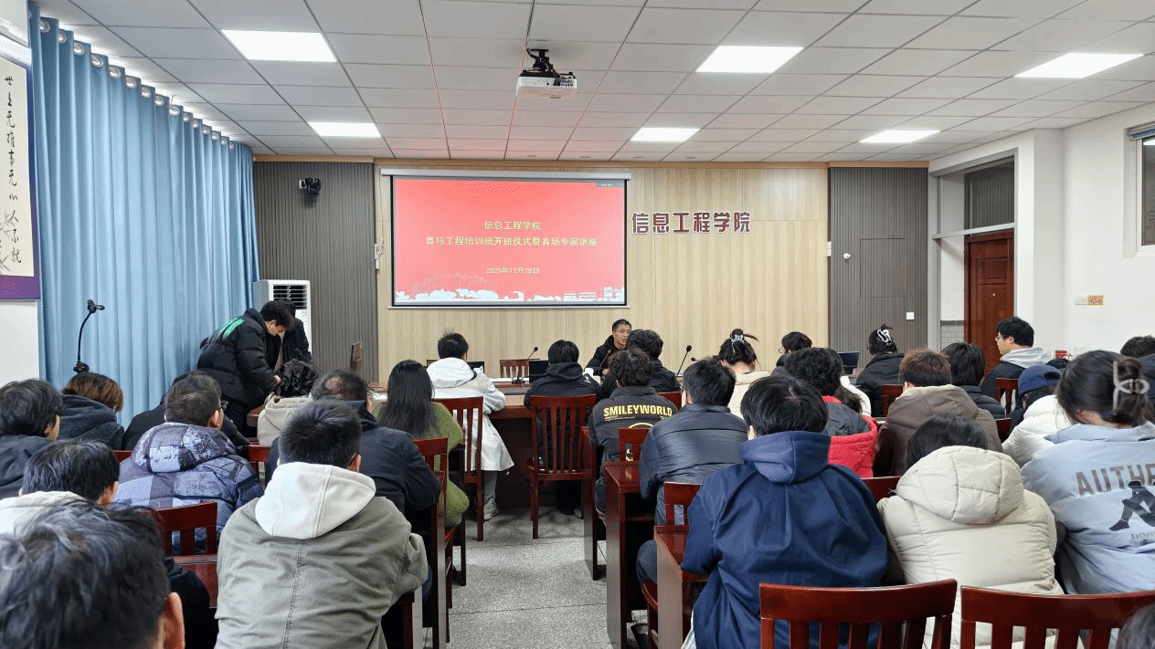 为深入学习贯彻习近平新时代中国特色社会主义思想,扎实推进青年马克思主义者培养工程,锻造忠诚可靠的青年政治骨干,12月28日15时,信息学院“青马工程”培训班开班仪式暨首场专家讲座在怀德楼B410会议室隆重举行。本次活动由学院学生会副书记陈致远主持,学院党委副书记王源、团委副书记纪锦霖出席,23级至25级全体学生干部参训。