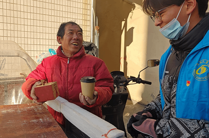 信息学院大学生志愿者配合社区工作人员搭建并布置义卖场地,将残疾人制作的银耳羹、平安果等劳动成果整齐摆放,向过往行人售卖。大学生志愿者想出了许多暖心的话语,“卖银耳羹,喝了以后全身暖暖和和 ,卖平安果,吃了以后天天平平安安!”,经过数小时的努力,大家成功将商品全部售出。志愿者们赴沿河社区,为老年人介绍此次义卖活动的意义,并给他们送上精美的礼品,送上诚挚的祝福。社区老人纷纷表示此次活动让大家感受到冬天的温暖,看到志愿者们积极工作的青春活力,感谢志愿者们的爱心与奉献。