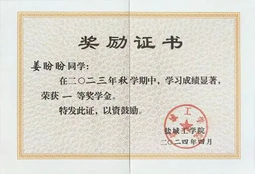 三次获评一等奖学金,一次获评二等奖学金,连续两学年获评校三好学生