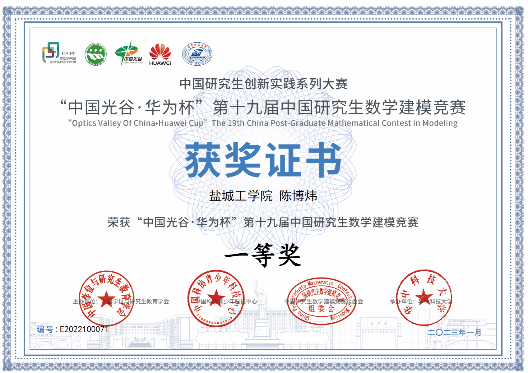 “华为杯”中国研究生数学建模竞赛第19届全国一等奖、第20届全国二等奖