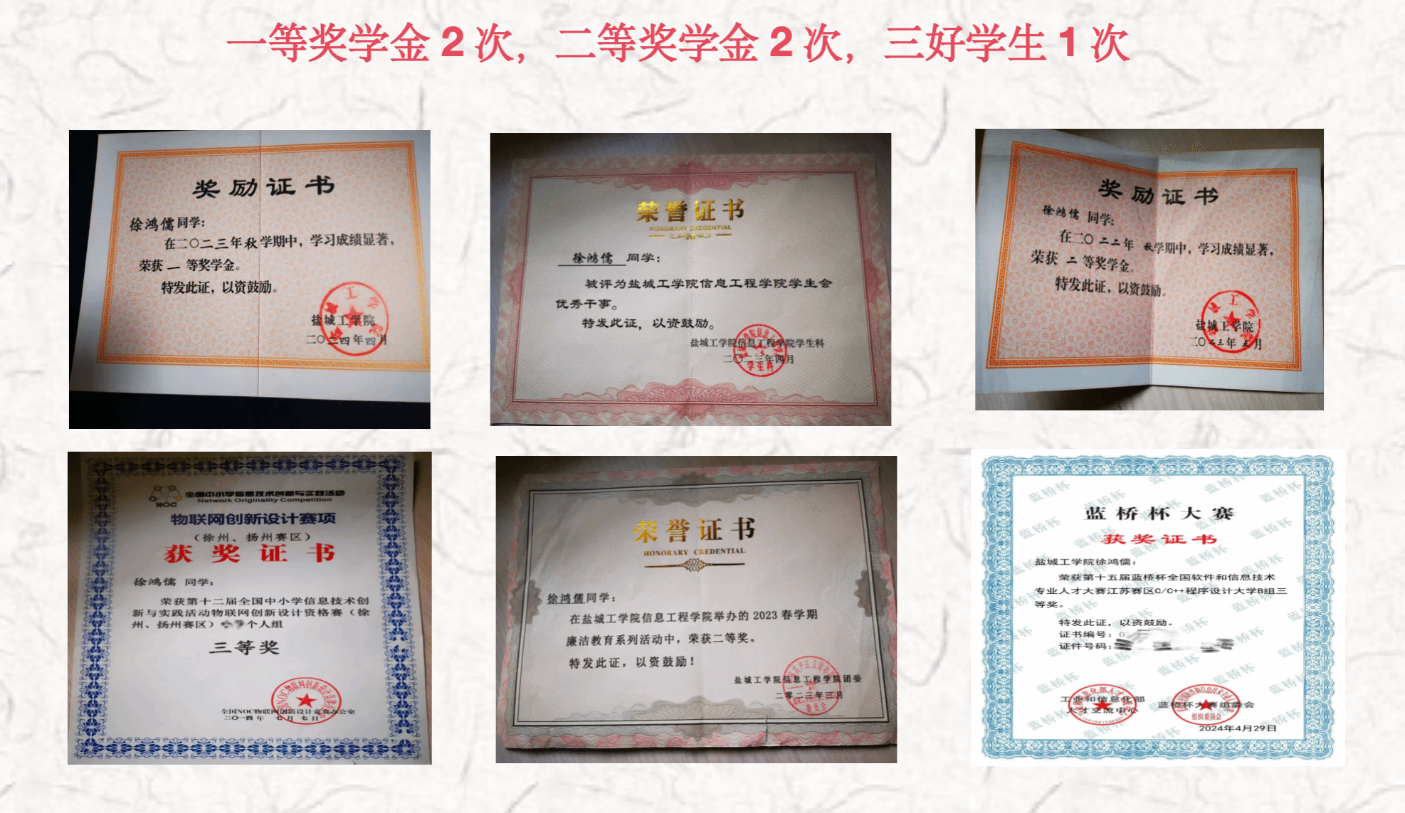 两次获得校一等奖学金、两次校二等奖学金,一次三好学生,学生会优秀干事,第十五届软件类C/C++程序设计大学B组三等奖,物联网创新设计赛项三等奖等奖项。