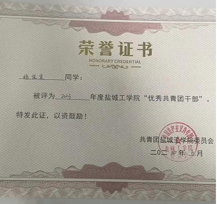 作为党员干部,她信念坚定、对党忠诚,始终坚守初心使命,践行服务师生的责任担当;严守纪律规矩,恪守校规校纪,团结同学、乐于助人,努力争当优秀的“盐粒子”。曾获“优秀共青团干部”。