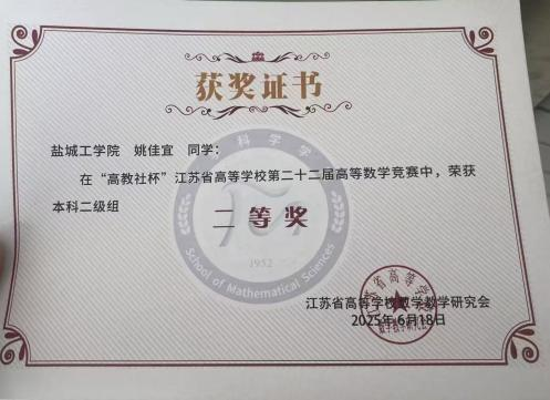 一次获评省级数学竞赛二等奖