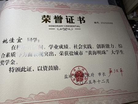 一次获评本科生“黄海明珠”奖学金