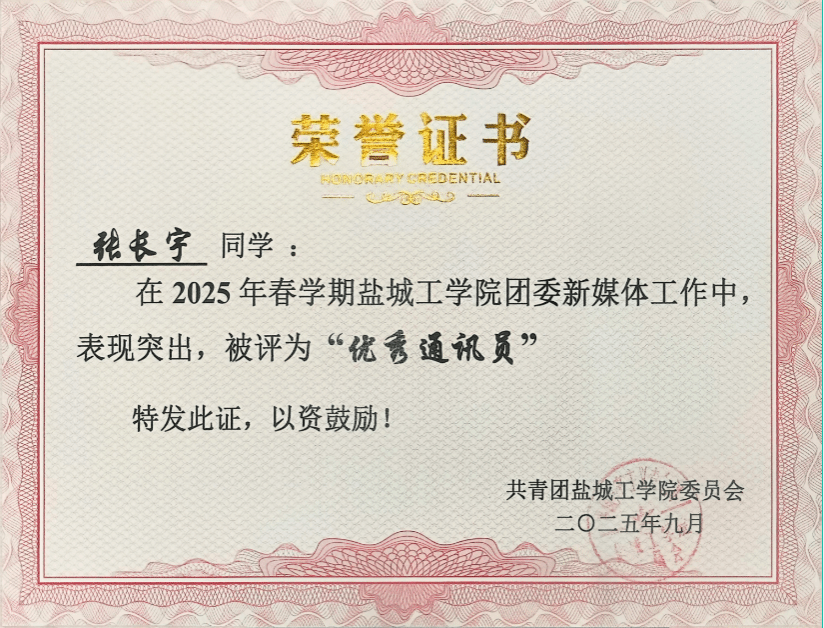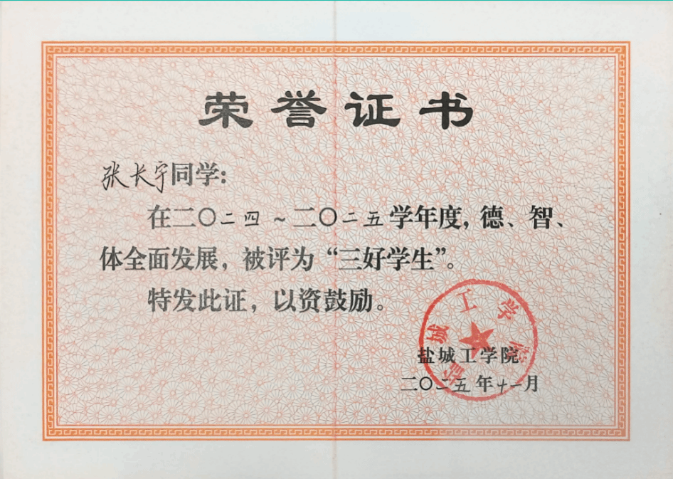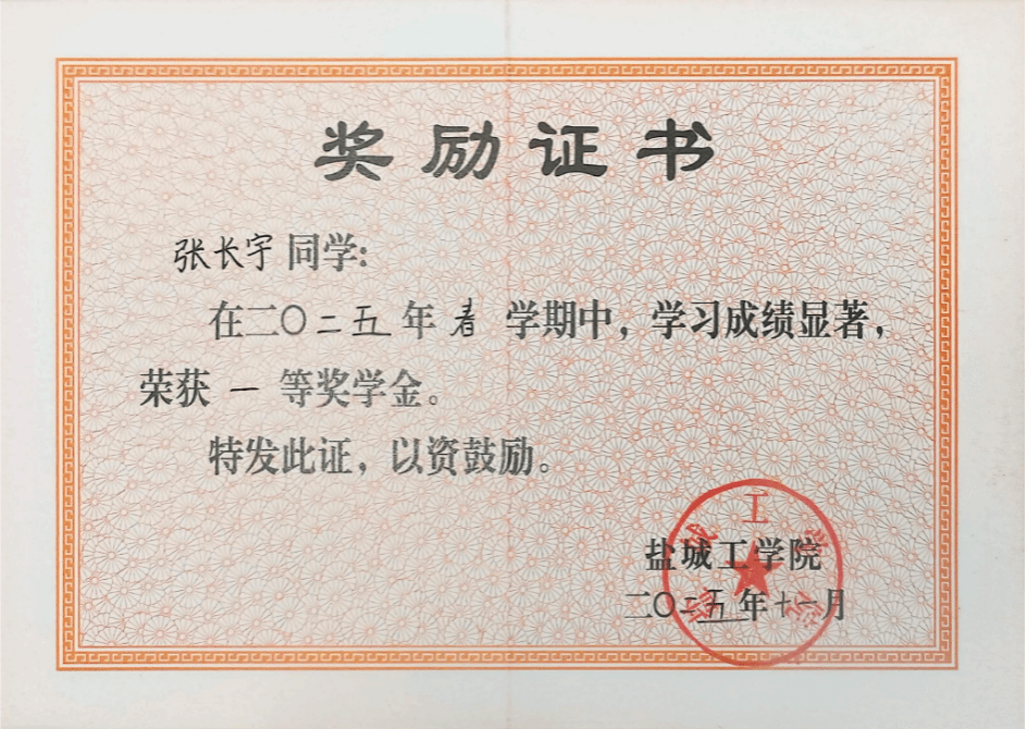 一次获评盐城市“黄海明珠”奖学金