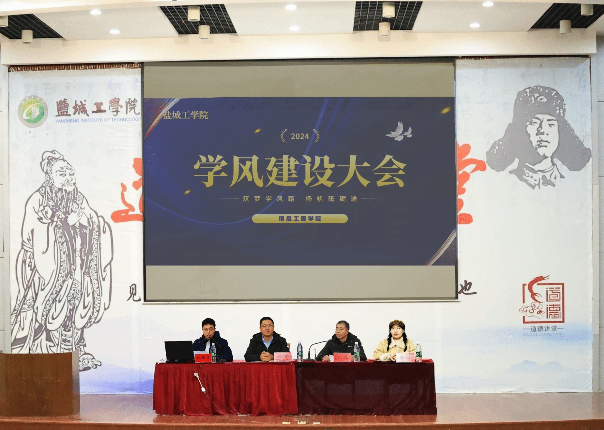 为落实立德树人根本任务,促进学院优良学风建设,激励广大学生向身边的优秀典型学习,12月4号晚,信息工程学院于希望大道校区五四报告厅召开2023级学风建设大会。学院副院长周锋、党委副书记王源、辅导员赵艳及全体2023级学生参加。学院团委副书记纪锦霖主持会议。
