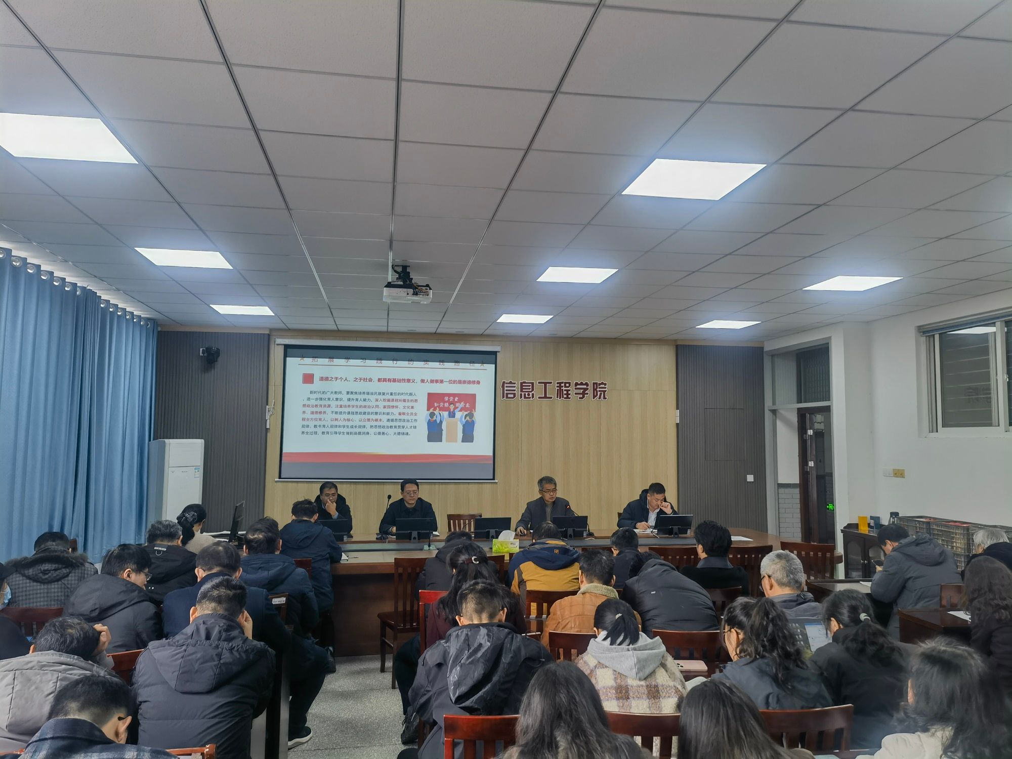 3月12日下午,信息工程学院全体教职工在怀德楼B410会议室开展2025年春学期第一次常规政治理论学习。本次学习的内容包括:《新时代加强师德师风建设的着力点》,《促进高质量充分就业》(习近平,《求是》2024年21期)节选。