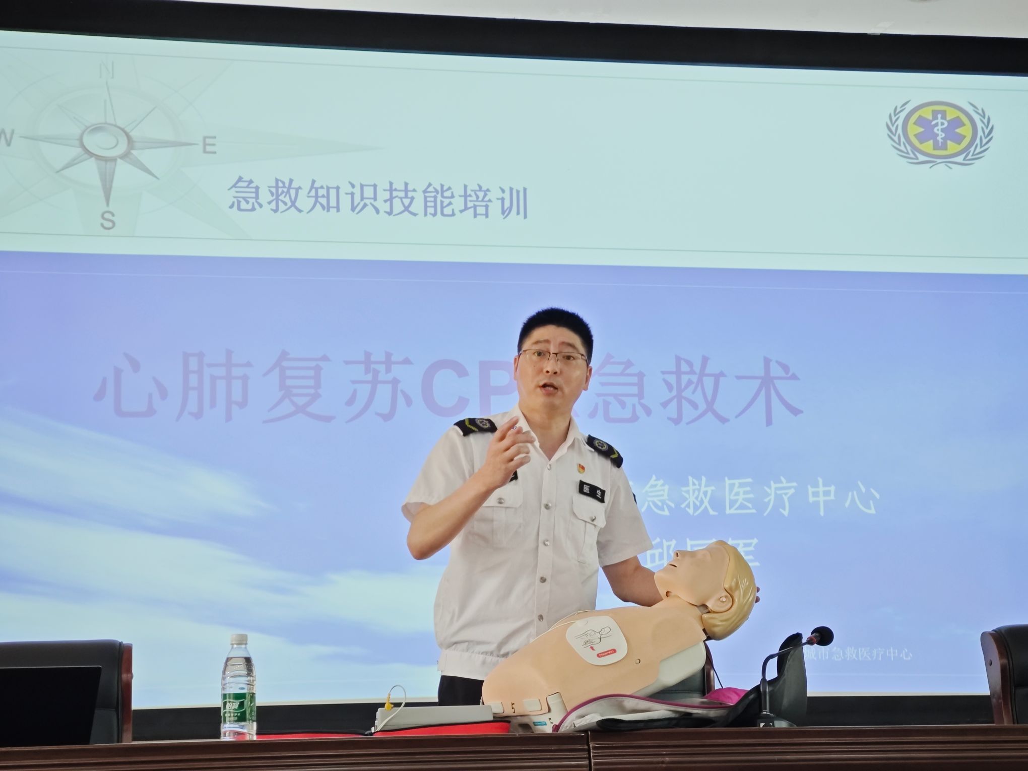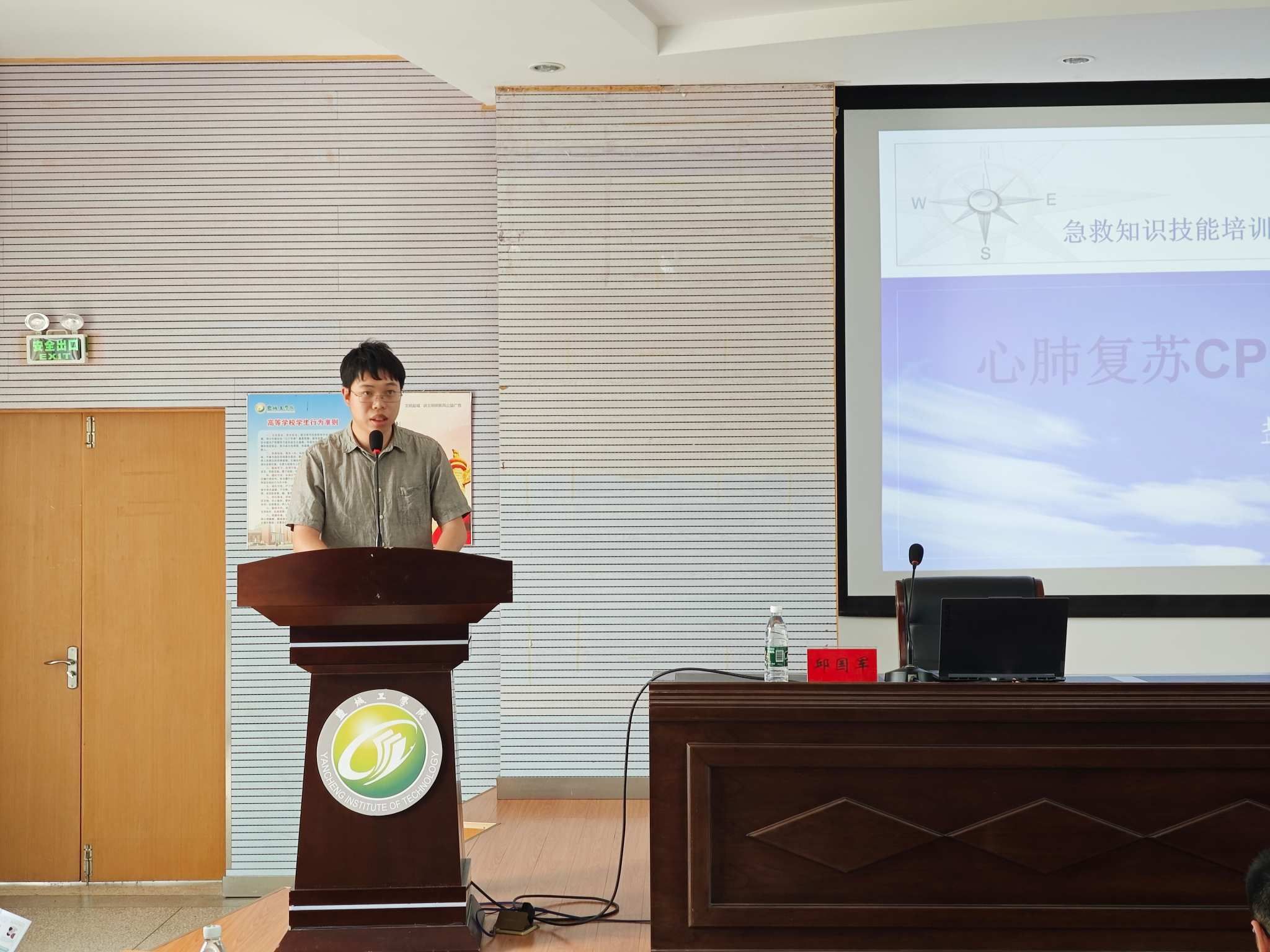 讲座中,盐城市急救中心邱国军科长结合案例与视频,围绕心肺复苏 CPR 急救术展开科普讲解。他强调心脏骤停 “黄金 4 分钟” 是与死神赛跑的关键,此时心肺复苏是解救生命的重要手段,并通过详细讲解操作步骤与注意事项,使师生对心肺复苏的操作流程形成清晰认知。