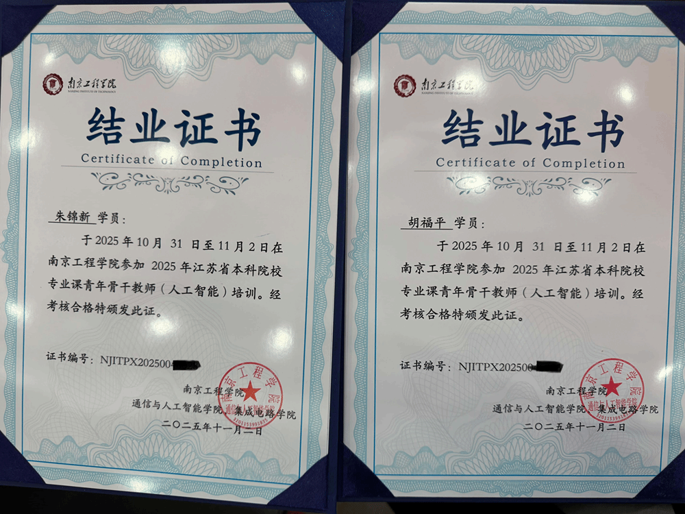 2025年10月31日至11月2日,由江苏省教育厅主办、南京工程学院承办的“2025年江苏省本科院校专业课青年骨干教师(人工智能)培训班”在南京工程学院江宁校区成功举办。信息工程学院计算机系朱锦新主任和胡福平老师代表学校参加了此次培训。