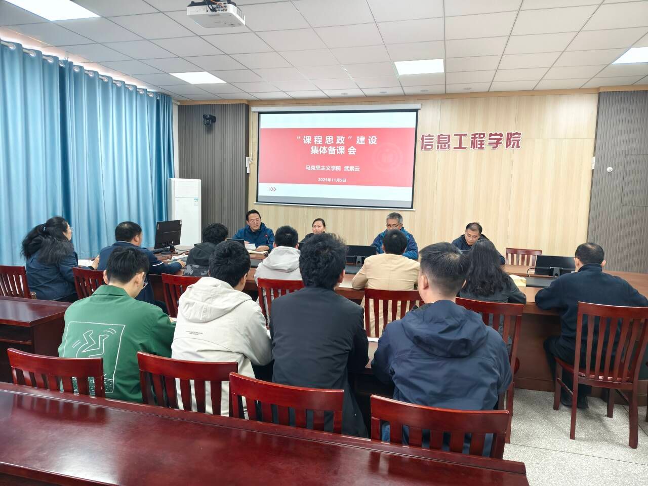 2025年11月5日下午,信息工程学院邀请马克思主义学院武素云副教授在怀德楼B410会议室开展课程思政集体备课会,共同探讨如何将课程思政内容巧妙融入课程教学中。会议由教学院长徐森主持,学院党委书记杨军、副书记王源,以及学院青年教师及骨干教师参加。