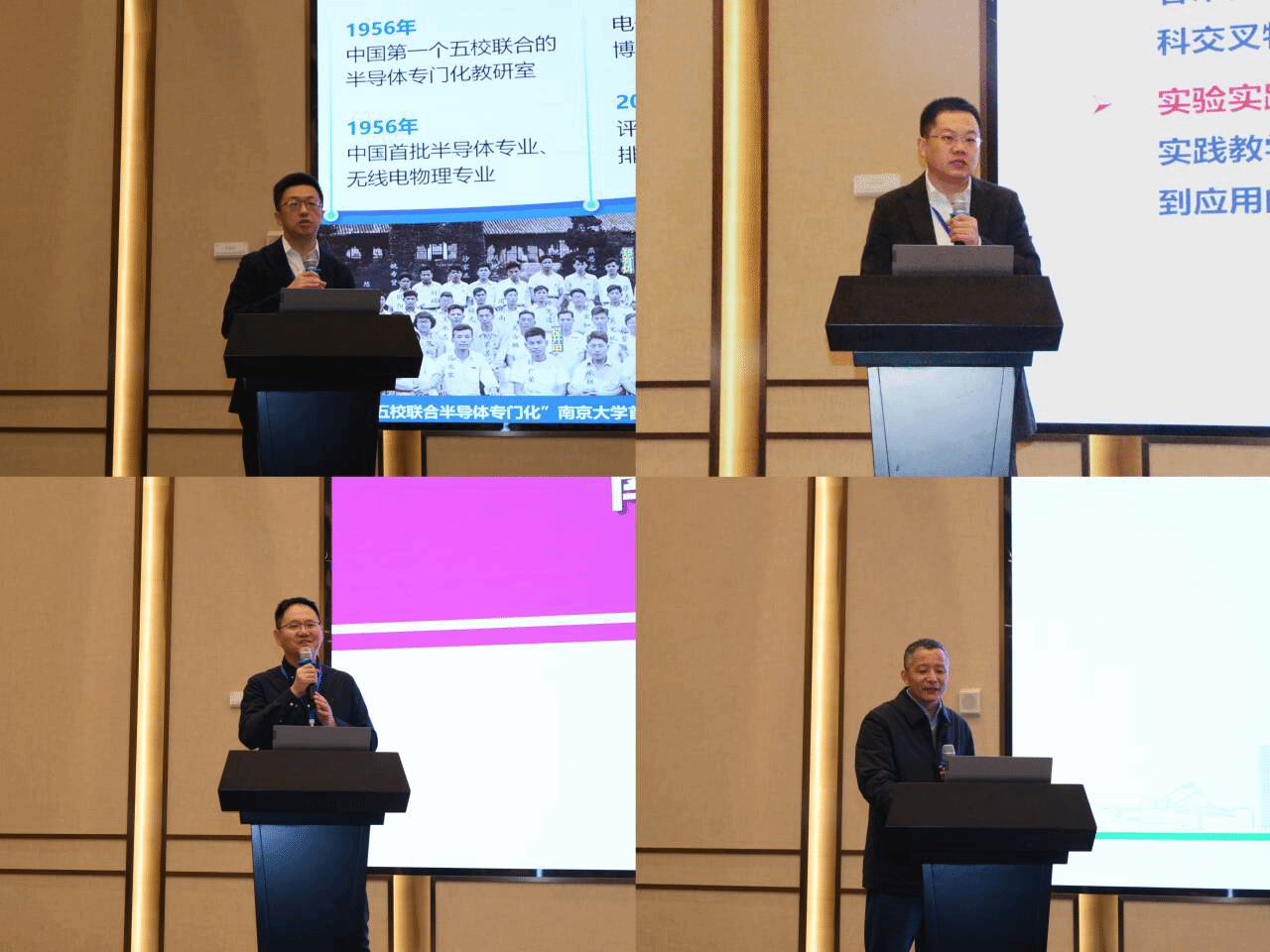 在报告环节,多位省内高校的专家学者带来了精彩分享。南京大学电子科学与工程学院院长,国家级人才刘斌以《前沿驱动 AI 赋能——构建科教产教融合模式培养电子信息创新人才》为题,介绍了南京大学电子科学与工程学院的建设概况和学院“五个结合”的人才培养模式,并探讨了如何在电子信息高速发展中实现适应新质生产力的创新人才培养;南京邮电大学物联网学院院长赵海涛分享了《“三物一体” 南邮物联网人才培养十年探索与实践》,系统总结了人才培养与产业链/创新链的衔接问题、专业教学内容跨学科知识的融合问题、实验实践对创新能力培养的支撑问题;南京理工大学电子工程与光电技术学院院长隋修宝围绕《南京理工大学光学工程学科建设与十五五规划》,展现了重点学科在学科建设与未来规划中的前瞻布局,围绕“着眼国家战略目标、面向国际科技前沿、提高自主创新能力”的目标,凝练了4个特色显著、具有国际先进水平的优势学科方向;盐城工学院信息工程学院院长王如刚则聚焦应用型人才培养,作《面向 “十五五”:应用型电子信息类人才培养的战略转型与路径探索》报告,学院依托校政企协同基础,主动对接盐城绿色低碳发展与产业智能化转型,积极探索基于本地产业场景的“强实践、跨学科”复合型、创新型人才培养新路径,致力于推动人才链与产业链的深度融合,为地方高校电子信息类人才培养的转型发展提供了实践思路。