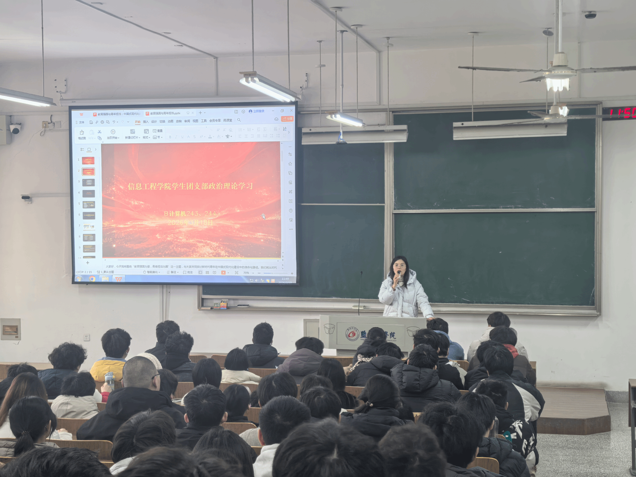 3月18日,信息工程学院D计算机241 - 243班在博学楼D405举办了政治理论学习、安全教育主题班会及寒假社会实践成果汇报系列活动。活动由学院党委副书记王源老师主持,全体同学积极参与。在理论学习环节,师生共同研读了习近平总书记的重要讲话精神,深入领会了教育强国的深刻内涵,凝聚起“强国有我”的青春共识。安全教育班会上,围绕宿舍管理、反诈上网、学业发展及AI规范使用等方面提出了明确要求,进一步强化了学生的纪律与安全意识。