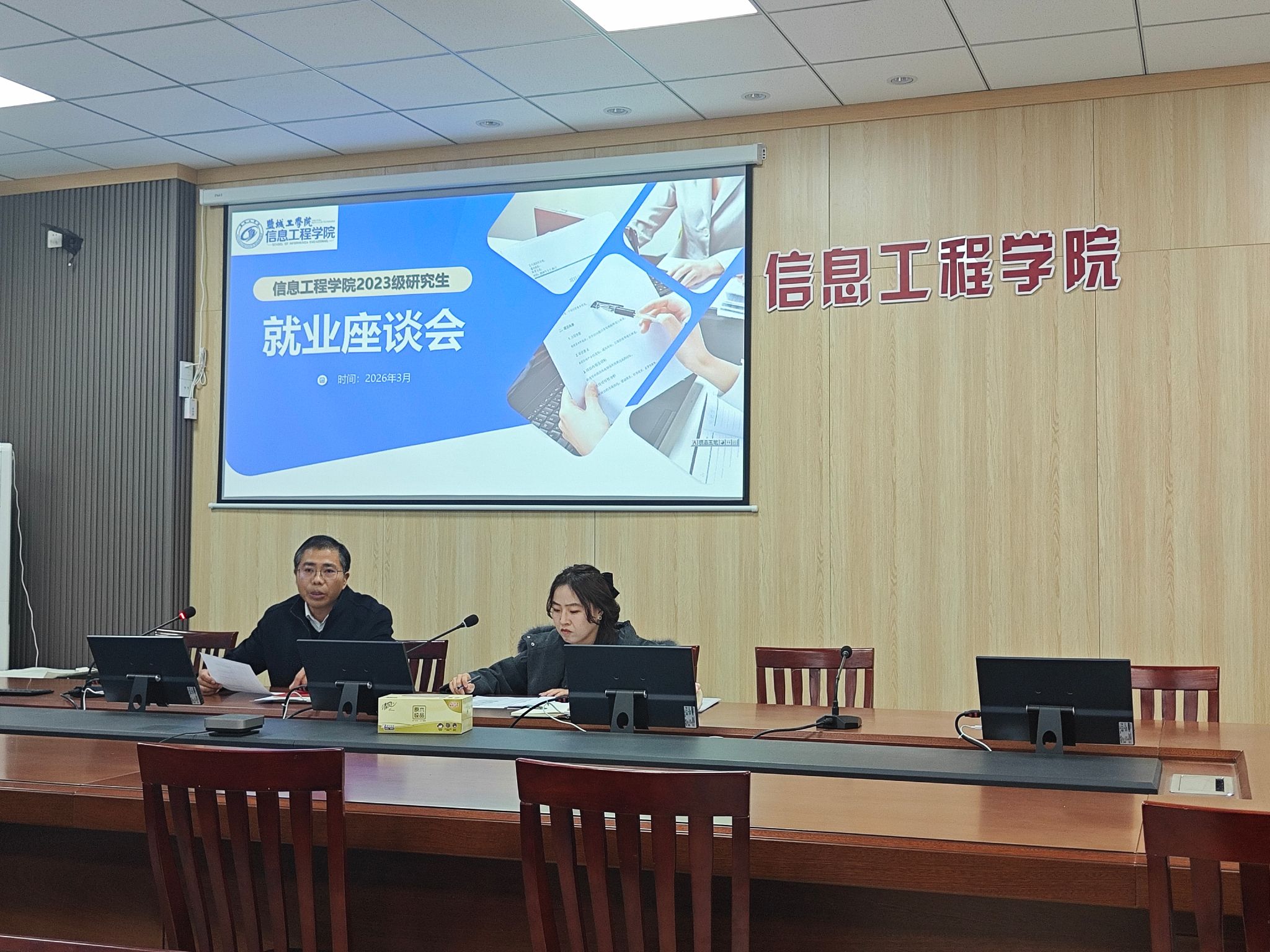 为扎实推进2026届研究生就业工作,精准解答求职困惑、强化职业规划引导,2026年3月31日上午,信息工程学院于怀德楼B410会议室召开研究生就业专题座谈会。学院党委副书记王源、研究生辅导员许玥出席会议,全体2024级研究生参会。会议聚焦当前就业新形势,围绕就业形势研判、求职策略制定、在校期间管理及多元发展路径等维度展开深入交流,旨在为研究生就业创业提供精准化指导。
