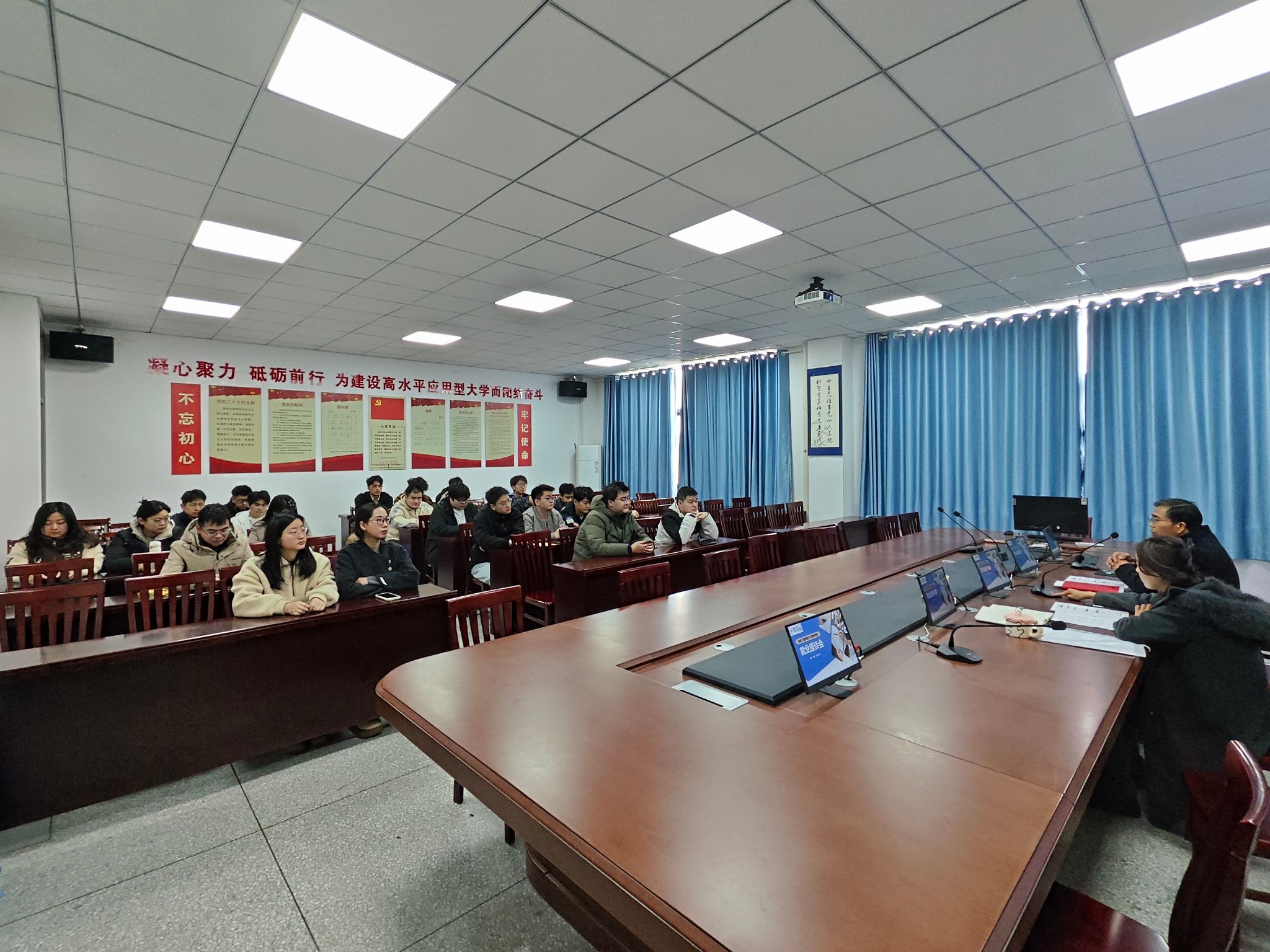 会上,王源针对研究生关注的核心问题进行了细致解答。他建议同学们采取“多线并行”的求职策略,统筹兼顾实习、就业与考公考编,避免因全职备考造成职业空窗期。结合当前就业环境,王源指出,攻读博士学位不仅是缓解就业压力的可选路径,更是提升个人核心竞争力的有效途径。他强调,实现高质量就业既是个人成长的内在需求,也是为学校高质量发展贡献力量的应有之义。