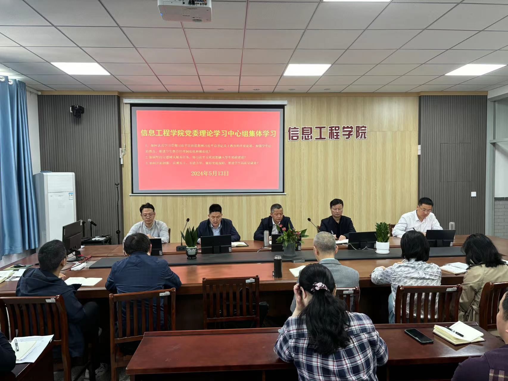 5月13日上午,信息学院党委理论学习中心组在南校区怀德楼B410会议室召开集中学习研讨会,重点学习习近平法治思想、习近平文化思想和习近平总书记关于党的纪律建设、关于教育的重要论述。学院党委书记王爱军主持,学院党委理论学习中心组全体成员参加。