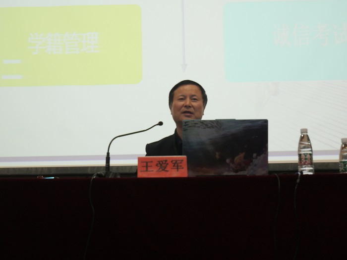 王爱军以“新起点、新目标、新征程”为题作学籍管理报告,从“我们的信息、学籍管理、学位授予、诚信考试”四个方面介绍了学籍管理方面的内容,指出大家选择信息学院是明智和幸运的,要求大家牢记入学注册、考核评价、课程选课、学籍处理方面的规定,提醒大家注意学位授予条件,并对大家提出诚信考试的要求。
