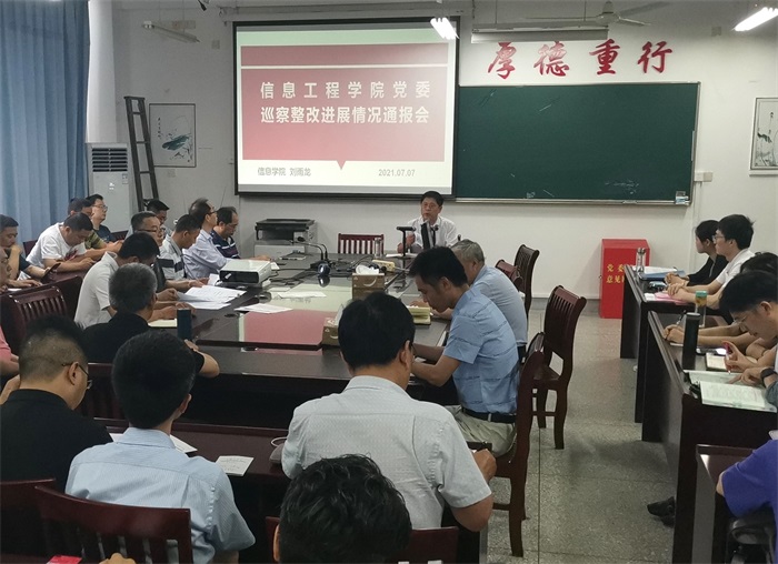 7月7日下午,信息工程学院在怀德楼学院会议室召开巡察整改情况通报会。会议由学院党委书记刘雨龙主持,校纪委朱孟峰老师和学院教职工参加会议。