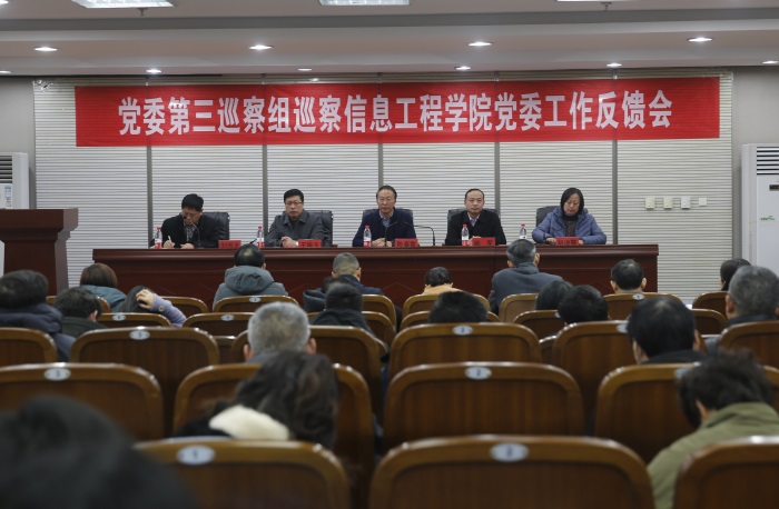 1月5日下午,党委第三巡察组巡察信息工程学院党委工作反馈会在希望大道校区图书馆报告厅召开。校党委巡察工作领导小组副组长、党委常委、纪委书记、省监委派驻监察专员陈春雷,第三巡察组组长、党委常委、统战部部长姚军,党委第三巡察组、意识形态专项督查组全体成员,信息工程学院全体教职工参加会议。反馈会由巡察组副组长胡凌霞主持。