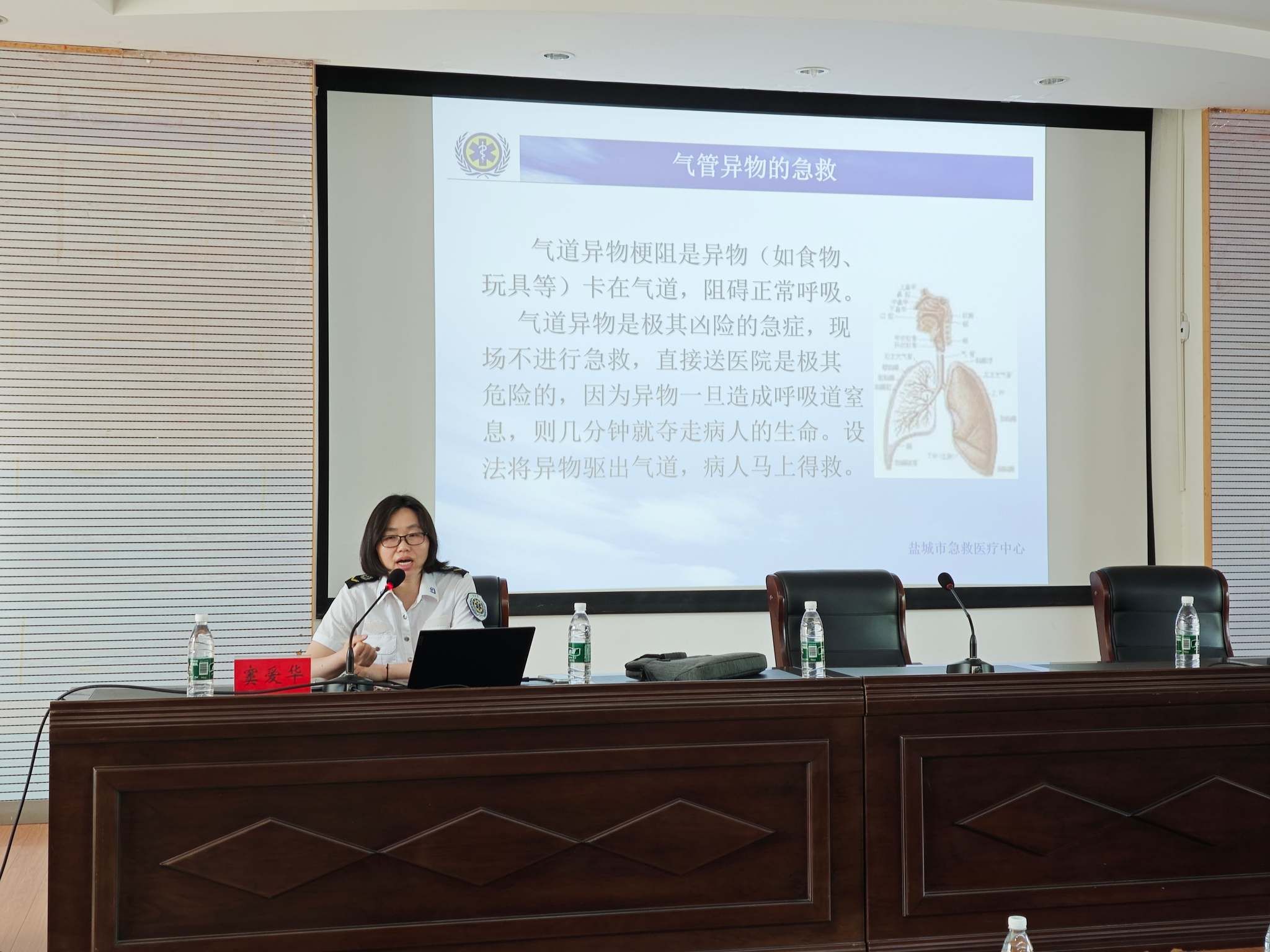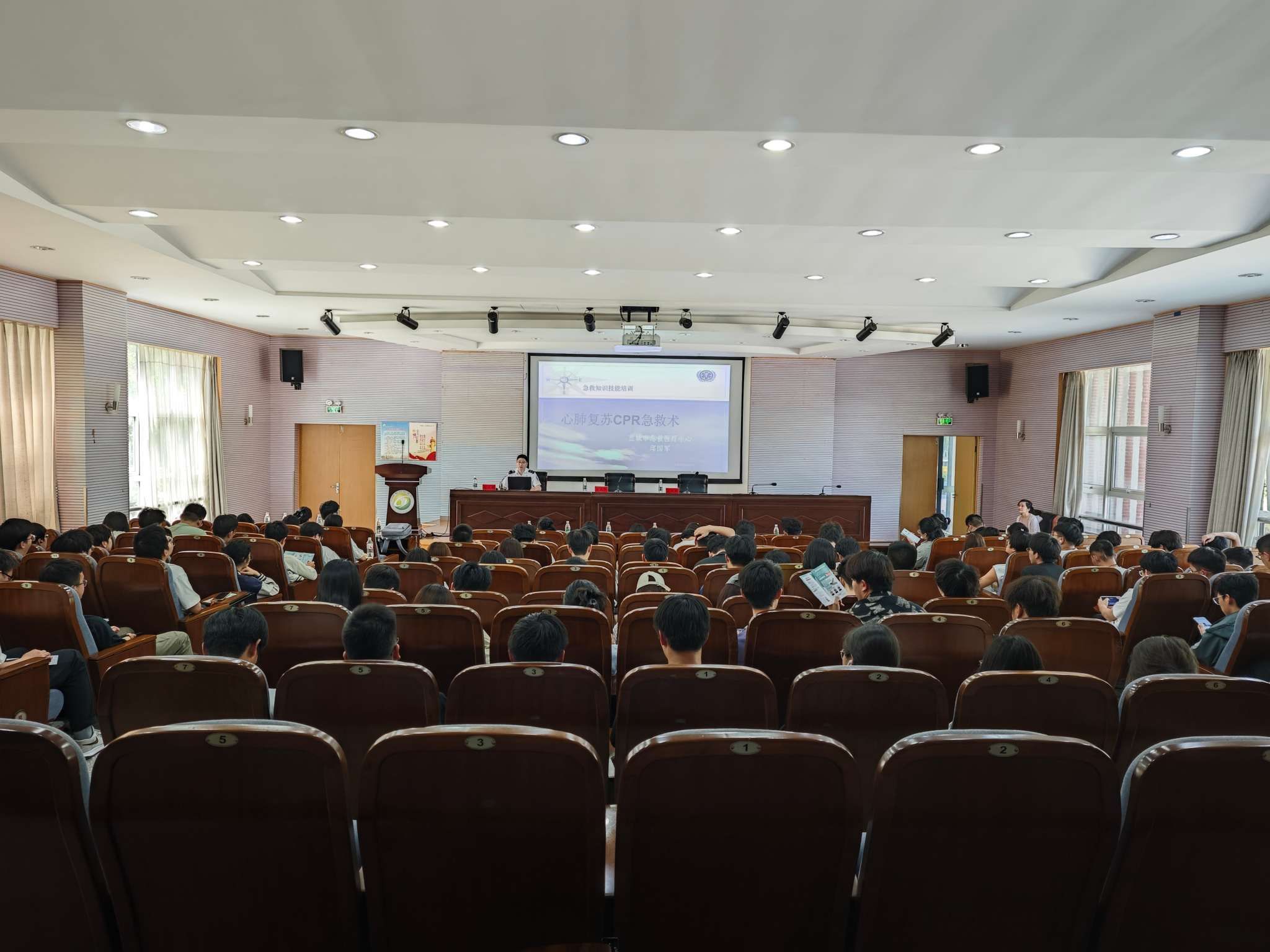 讲座中,盐城市急救中心邱国军科长结合案例与视频,围绕心肺复苏 CPR 急救术展开科普讲解。他强调心脏骤停 “黄金 4 分钟” 是与死神赛跑的关键,此时心肺复苏是解救生命的重要手段,并通过详细讲解操作步骤与注意事项,使师生对心肺复苏的操作流程形成清晰认知。