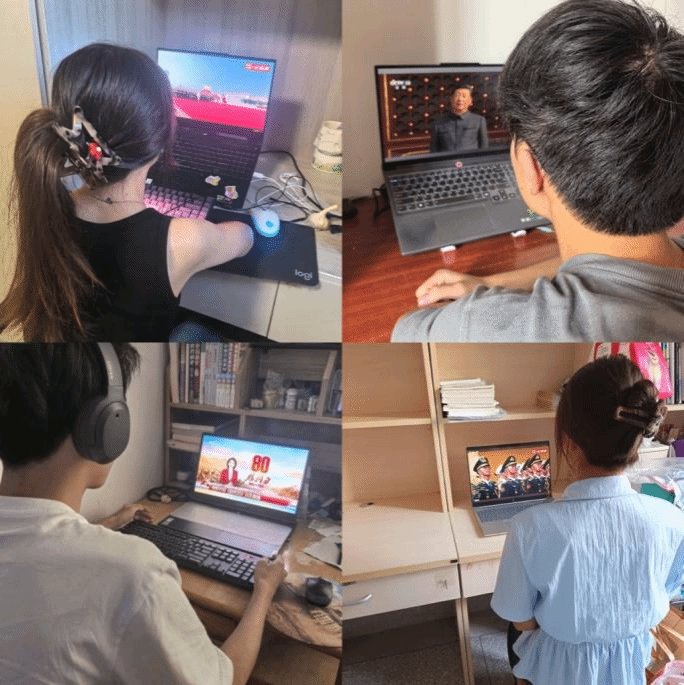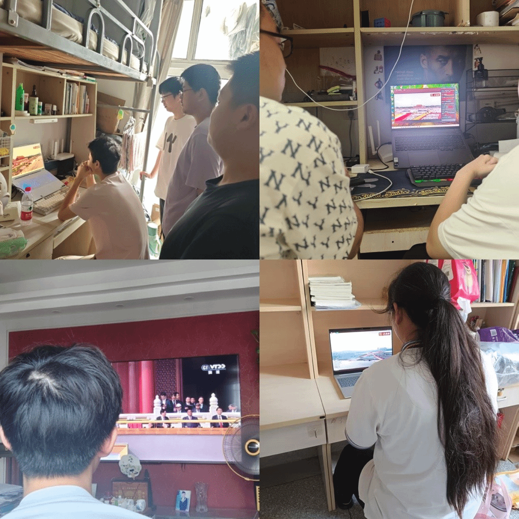 在分散观看点,学生们同样全神贯注。有的围坐在教室,有的聚集在宿舍,通过手机、电脑等设备认真观看。