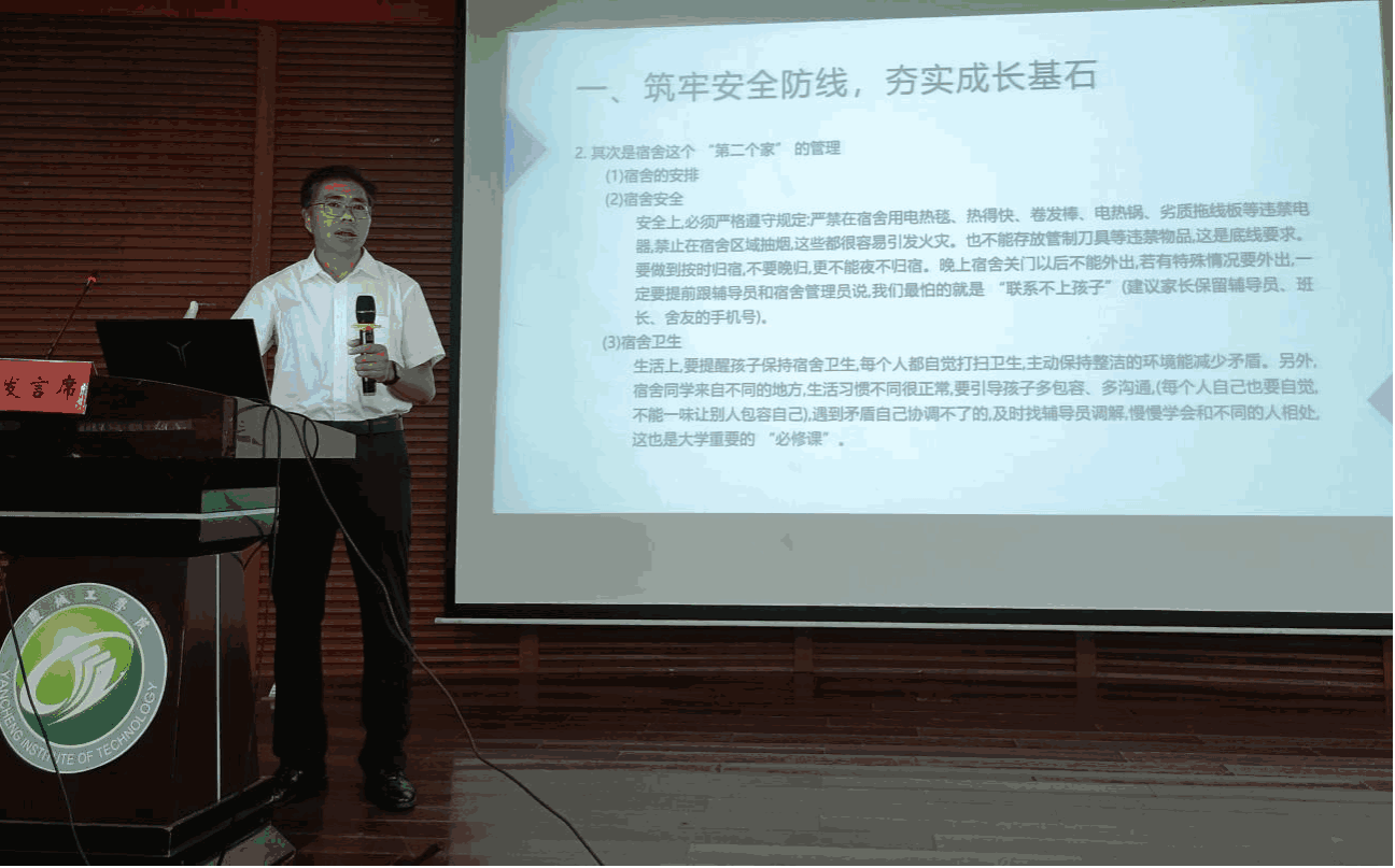 随后,党委副书记王源聚焦学生管理工作,以“家校携手护航成长,同心共筑育人桥梁” 为题展开讲解。他着重强调学生教育管理、生涯规划指导及家校协同合作的重要性,并结合学院实际工作,详细介绍了学生管理条例和注意事项。他鼓励家长主动参与学生成长过程,共同做好学生安全教育、防电信诈骗宣传、学习督促及生涯规划引导等工作。王源表示,家长若遇到问题可随时与学院沟通,保持密切联系,共同关注孩子的身心健康和学习生活情况,为学生创造良好的成长环境。