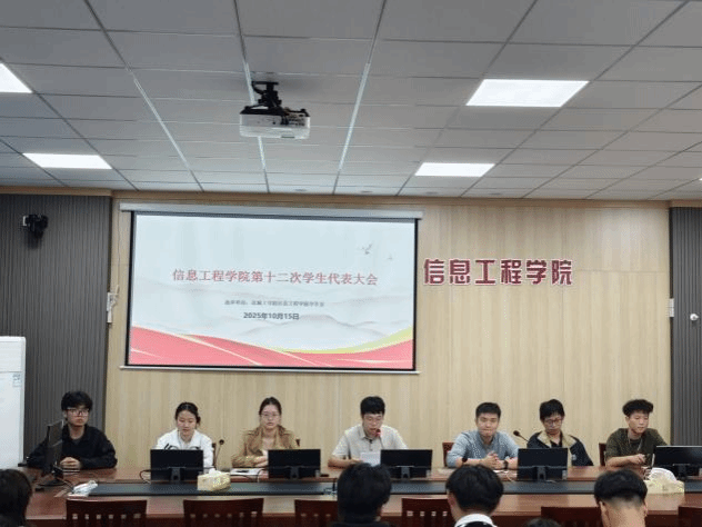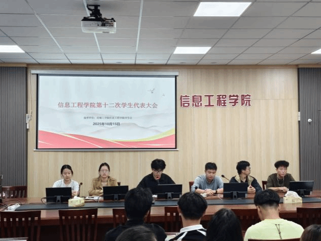 2025年10月15日19点,信息学院第十二届学生代表大会在南校区怀德楼 B410 召开。会议由学院团委书记纪锦霖主持,学院学生会主席团、部长团及学生代表共47人参加。