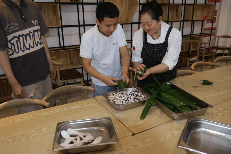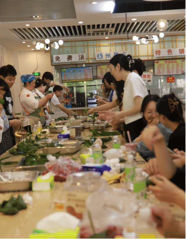 同学们分工协作,整理餐台,制作馅心,准备粽叶,迅速融入齐乐融融的包粽子的温馨氛围中。餐厅师傅们手把手教同学们如何包粽子,大家认真学习,试练、上手,很快的都做到技巧娴熟,学会包粽子的同学越来越多,包好的粽子也越来越多。