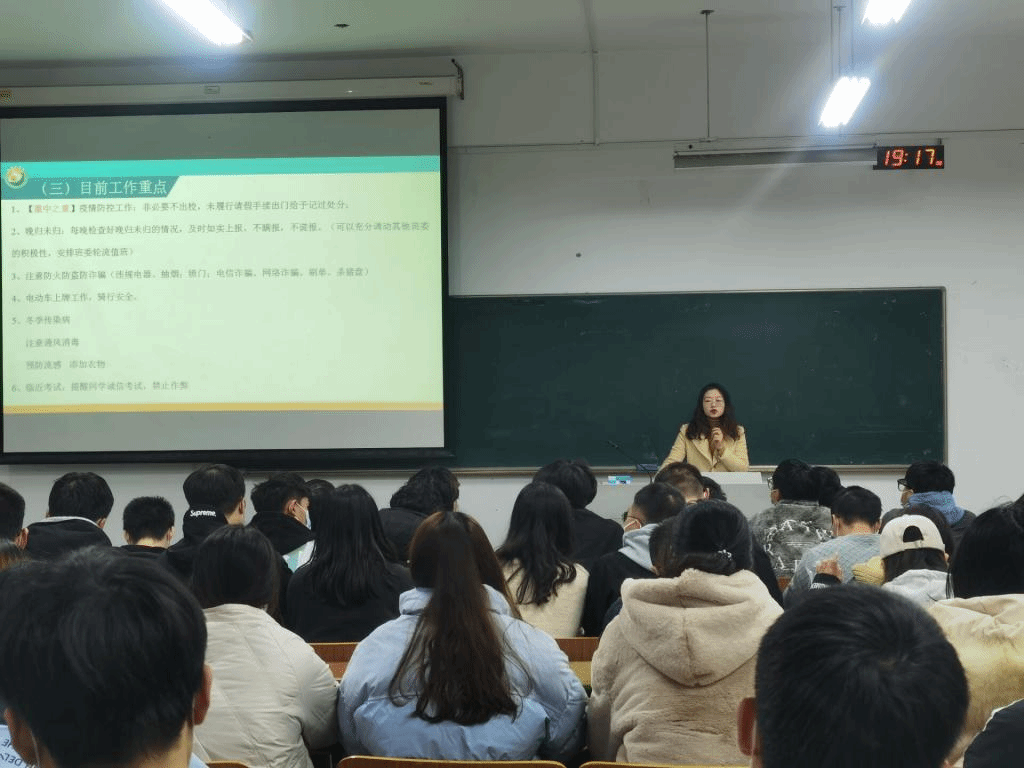 首先,专职辅导员仲思敏从什么是学生干部,学生干部有哪些职责,以及学生干部的主要工作开始入手,重温了学生干部的初心和使命。仲思敏聚焦疫情防控、传染病预防、安全问题、日常管理、学风建设等方面布置了近期的重点工作。从身边案例出发,要求同学们以身作则,发挥榜样模范作用,在提高自我认知的同时,坚定信念,脚踏实地。希望同学们能学会思考、提高学习效率、锻炼创造管理能力,努力成为更优秀的学生干部。