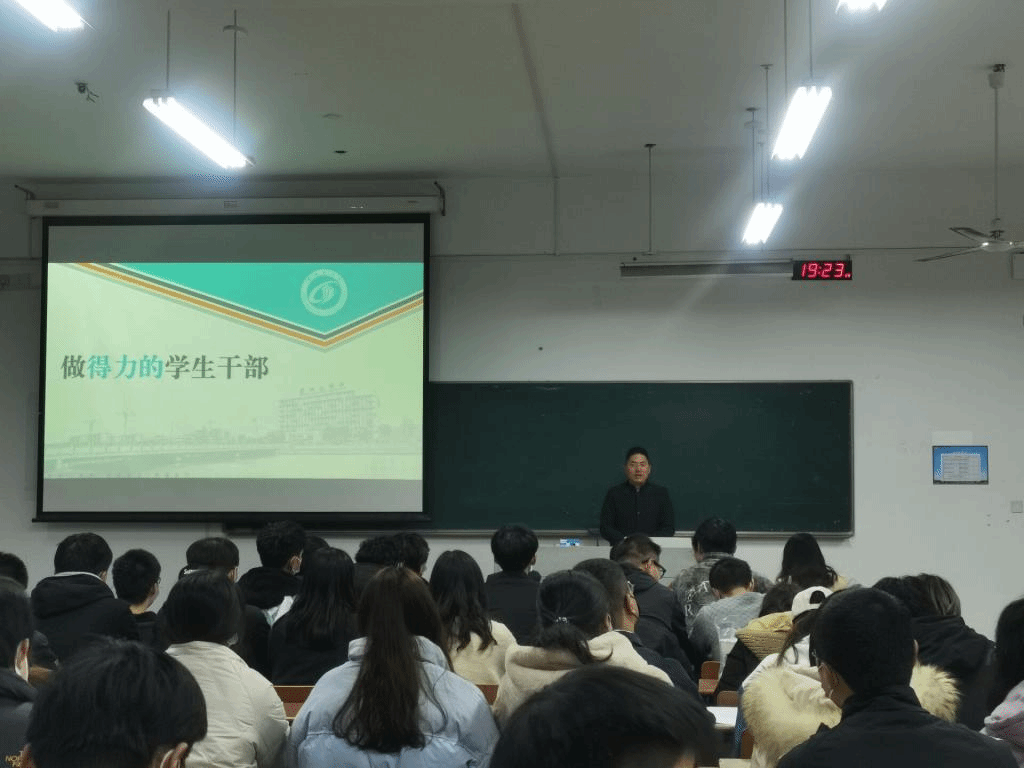 戴建从“学生干部有大我和小我的价值”角度出发,深入浅出,为同学们树立了正确的价值观,小我即锻炼自己,为班级做贡献;大我即为时代做贡献,为中国共产党的社会主义现代化建设做出贡献,为中国高等教育事业添砖加瓦。